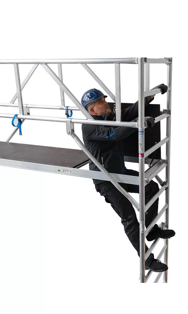• Upevnění úhlopříčných výztuh, zábradelních tyčí i podlážek je řešeno patentovaným tvarovým a současně svěrným spojením. Zajištění spoje se provádí jednoduše "zaklepnutím" tvarové západky kladívkem. Uvolnění spoje pak jednoduchým "vyklepnutím"