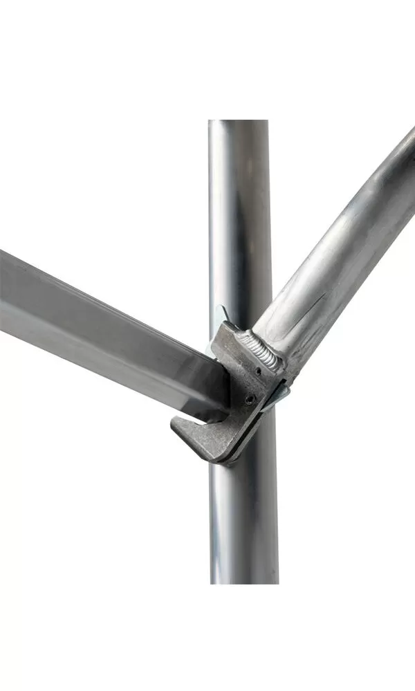 • Upevnění úhlopříčných výztuh, zábradelních tyčí i podlážek je řešeno patentovaným tvarovým a současně svěrným spojením. Zajištění spoje se provádí jednoduše "zaklepnutím" tvarové západky kladívkem. Uvolnění spoje pak jednoduchým "vyklepnutím"