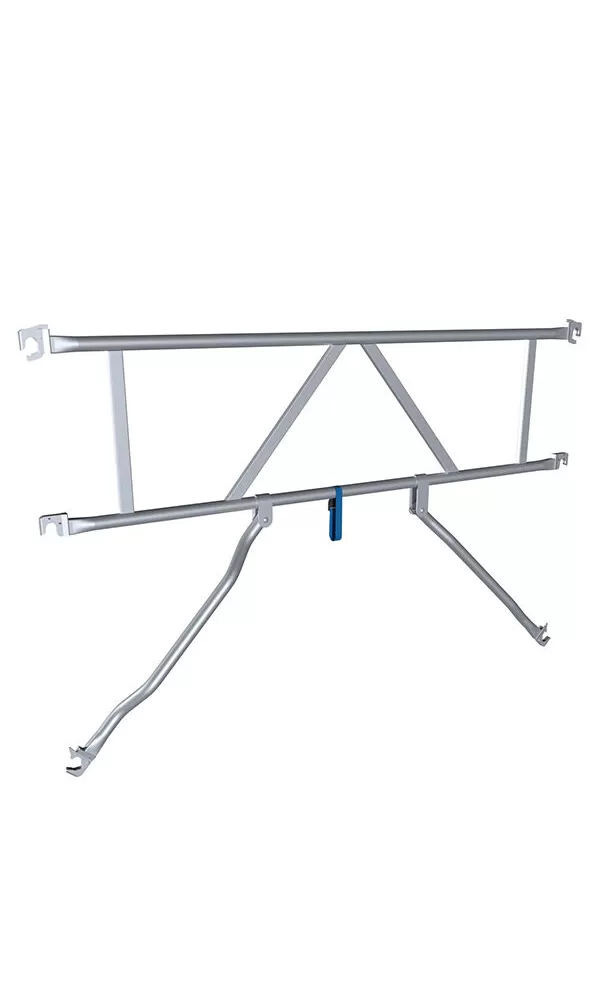 • Upevnění úhlopříčných výztuh, zábradelních tyčí i podlážek je řešeno patentovaným tvarovým a současně svěrným spojením. Zajištění spoje se provádí jednoduše "zaklepnutím" tvarové západky kladívkem. Uvolnění spoje pak jednoduchým "vyklepnutím"
