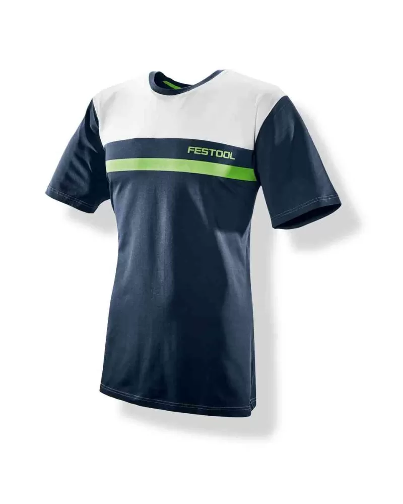 • Toto moderní pánské tričko z jednoduchého žerzeje s rovným střihem se díky vysokému podílu bavlny vyznačuje mimořádně komfortním nošením. Hravá kombinace kontrastních barev modré, bílé a zelené s decentním nápisem Festool odráží moderní trend „colour blocking“. Tričko je mimořádně příjemné díky teflonové povrchové úpravě, která je nejen příjemná na dotyk, ale slibuje i dlouhodobou stálost barev. Design dotvářejí drobné detaily, jako např. malá nášivka v bočním švu nebo kontrastní prošívání.
