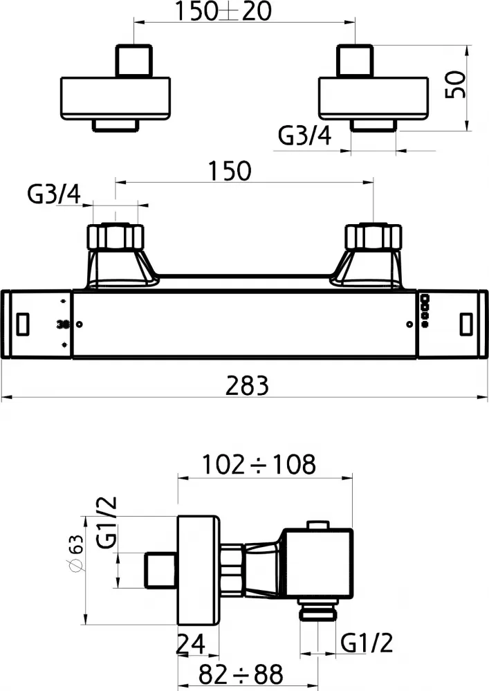 • Sprchová termostatická baterie s roztečí 150 mm se spodním vývodem vody