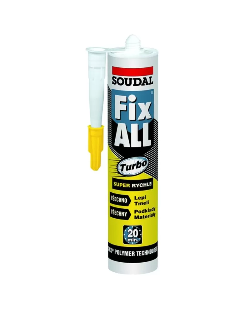 Fix ALL Turbo je nejrychleji vytvrzující lepidlo na bázi SMX® polymerů vhodné pro lepení, tmelení a utěsňování většiny materálů v interiéru i exteriéru. Má výbornou přilnavost na porézní i neporézní povrchy jako jsou: cihly, beton, ocel, železo, hliník, olovo, zinek, plasty, polystyren, polyuretan, dřevo, laminát, MDF, dřevotříska, sádrokarton, korek, mramor, přírodní kámen, žula, minerální vlna, keramika, porcelán, sklo atd. Trvale odolává působení plísní a je vhodné pro sanitární aplikace. Lepené spoje jsou zatížitelné již po 20 minutách.