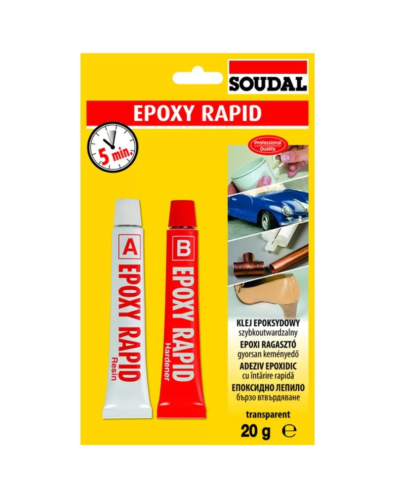 Vysoce kvalitní, rychletuhnoucí dvousložkové lepidlo s vysokou lepicí silou. Vhodné pro lepení většiny materiálů jako kov, dřevo, mramor, keramika, sklo, plasty, dřevotříska, kůže, beton, látky, guma. Doporučujeme pro lepení savých i nesavých hladkých povrchů, větších ploch i drobných částí. Po vytvrzení je vodě odolné, vytváří velmi pevný a trvanlivý spoj. Vzhledem k oddělenému balení jednotlivých složek v balení netvrdne a je vhodné pro opakované používání. Čas použití promíchaného lepidla: 5 minut, fixace lepených částí: 20 minut, plné vytvrzení: 2 hodiny.