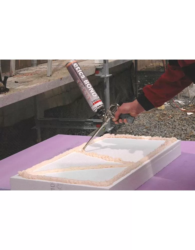 Lepicí pěna Etics BOND pro ekonomické a rychlé lepení tepelně izolačních desek na stěny a fasády. Lepící pěna má vynikající přilnavost na většinu podkladů jako beton, dřevo, dřevotříska, OSB, Cetris apod. Lepící pěna Etics BOND velmi rychle vytvrzuje, díky výborné přilnavosti na beton a požární odolnosti je vhodná pro použití v rámci lepených zateplovacích systémů.