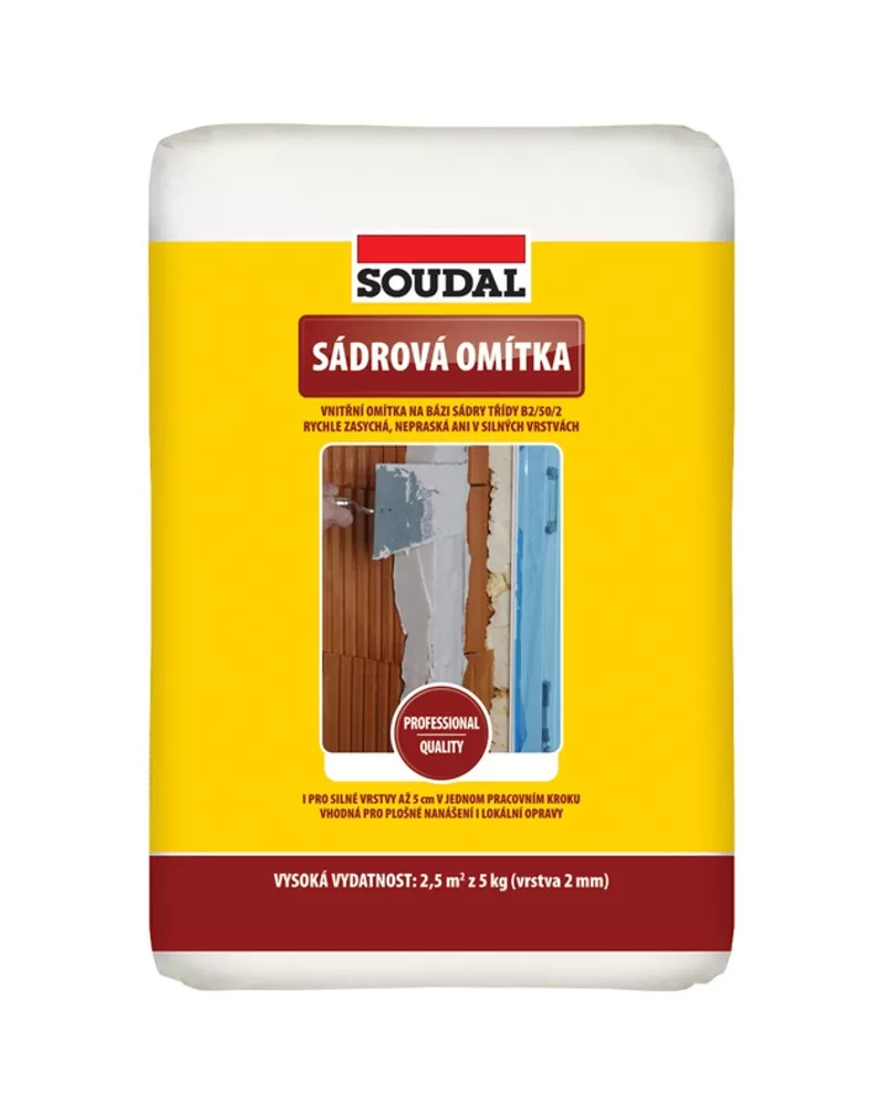 Sádrová omítka 20 kg Soudal 1521620 je jemná malta na bázi sádry k omítání stěn nebo pro opravy a začišťovací práce v interiéru. Dle způsobu aplikace vytváří jemně strukturovaný nebo hladký povrch. Snadno se zpracovává, pro lokální opravy lze nanášet v jednom pracovním kroku až v 5 cm silné vrstvě.