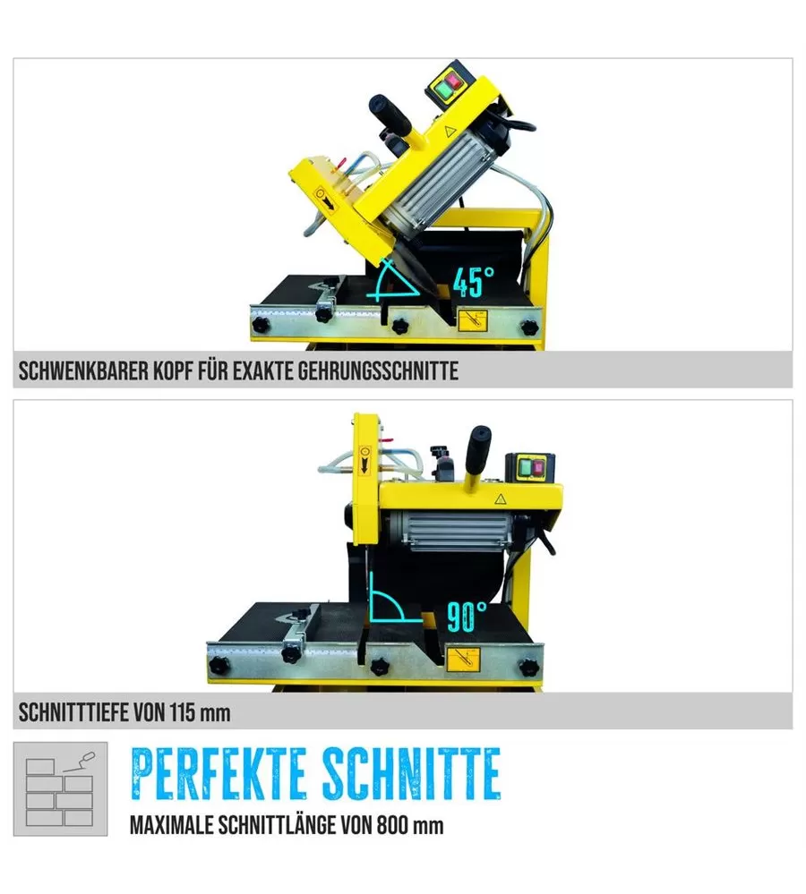 - Maximálna hĺbka rezu: 72 mm pri 45° a 115 mm pri 90°.