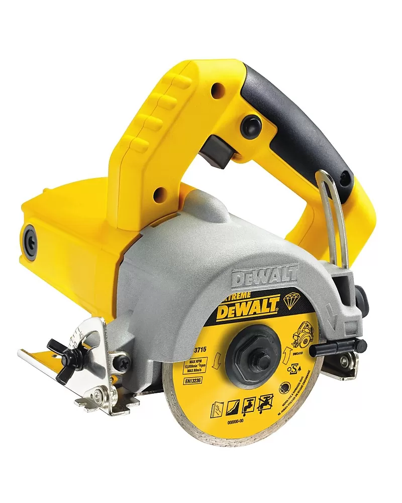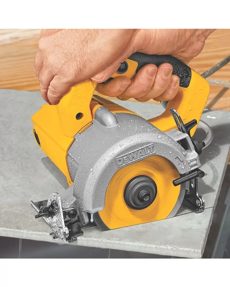 Ruční řezačka obkladů DeWALT DWC410 s dostatečným výkonem pro řezání žulových, porcelánových, betonových a ostatních kamenných materiálů.
