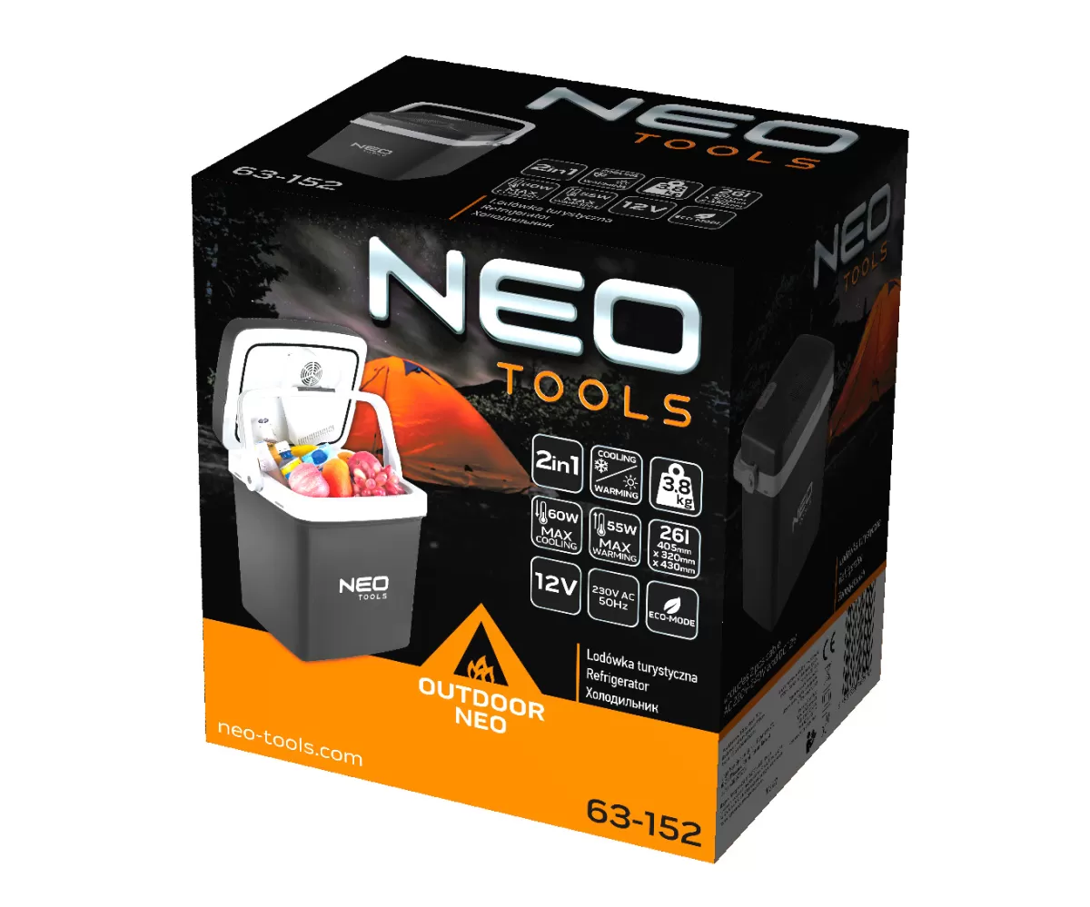 • Turistická chladnička 63-152 od společnosti NEO je spotřebič 2 v 1, který umožňuje jak ohřev (maximálně 55 W), tak chlazení (maximálně 60 W) uložených produktů