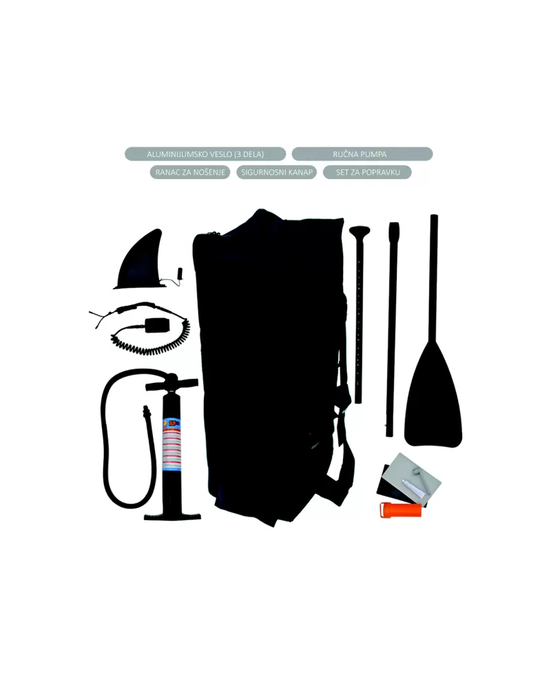 Součástí balení je 3dílné hliníkové pádlo s neoprenovou rukojetí, která umožní příjemné držení při sportu. Odnímatelná středová ploutev je ideální pro optimální manévrovatelnost i na rozbouřenějších vodách. Ruční pumpa vám pomůže bezpečně nafouknout prkno. Integrovaná síť s natahovacím lanem zase poslouží k bezpečnému uložení osobních věcí, a vy je tak budete mít stále u sebe. Pro snadnou přepravu celé sady je přibalena taška s vrchním madlem a nastavitelnými ramenními popruhy.