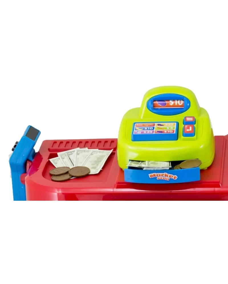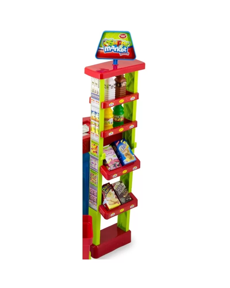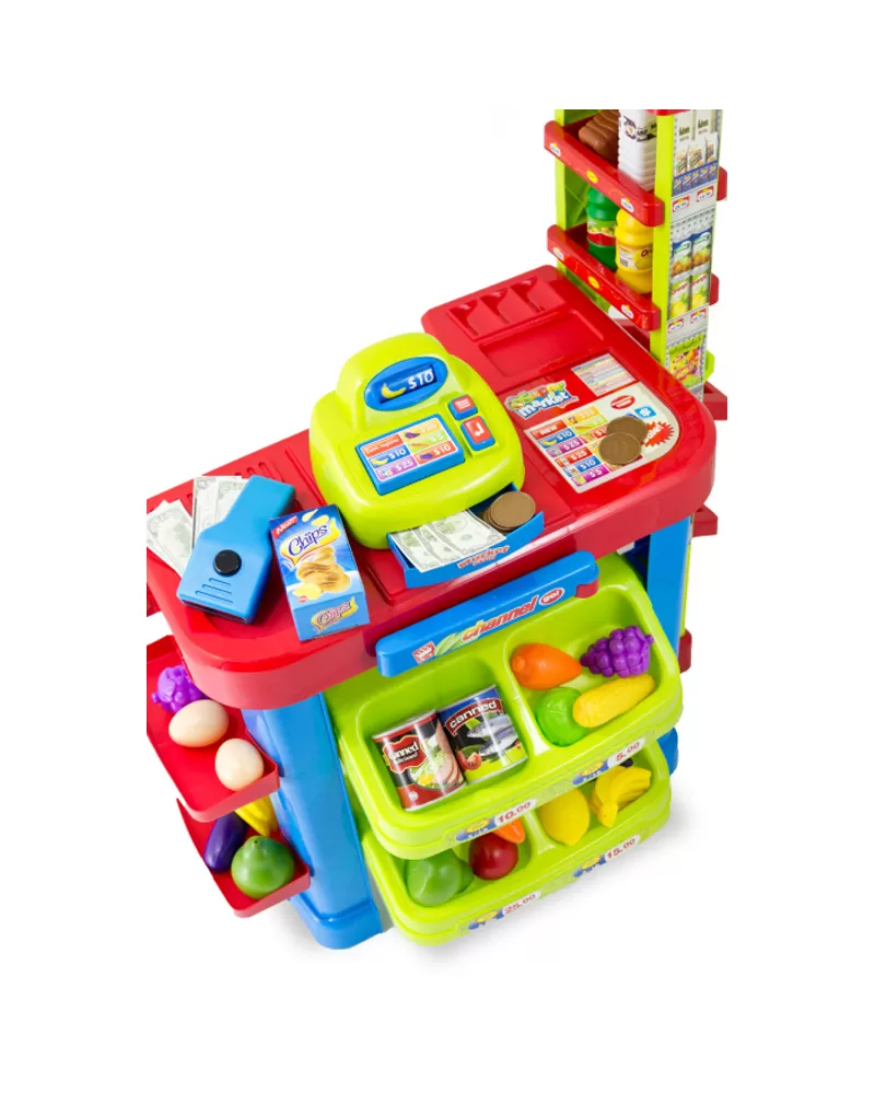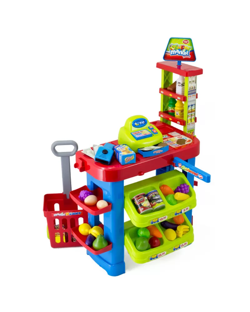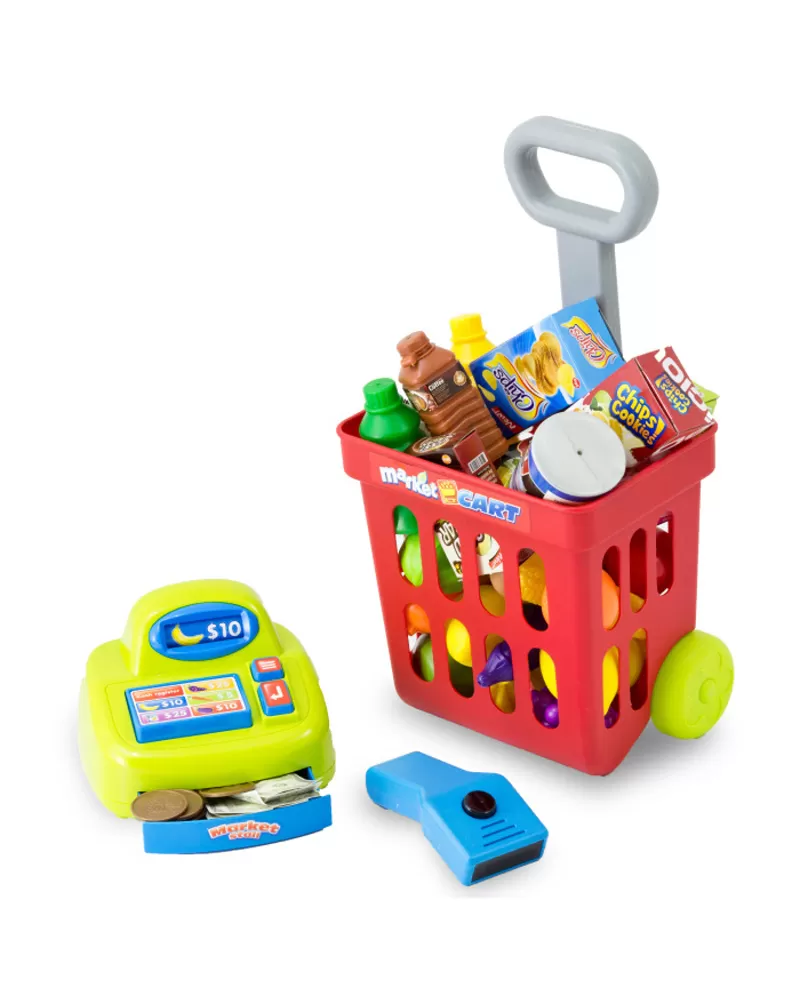 • Součástí je totiž samozřejmě pokladna s papírovými i kovovými penězi, čtečka čárového kódu (s reálným zvukem) a pro zákazníka košík na kolečkách.