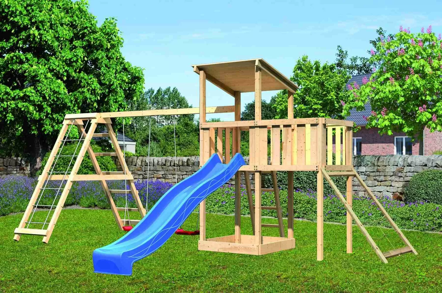 Dětské hřiště KARIBU ANNA 22310 LG3339 Dětské hřiště, půdorys 522 x 264 cm, věž 214 x 107 x 270 cm, modrá skluzavka, dvakrát houpačka, pískoviště… Celý popis