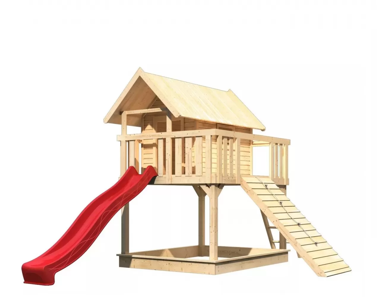 • Dětské hřiště, vnější rozměry š 198 x d 244 x v 329 cm, červená skluzavka, dřevěná rampa a místo pro pískoviště.