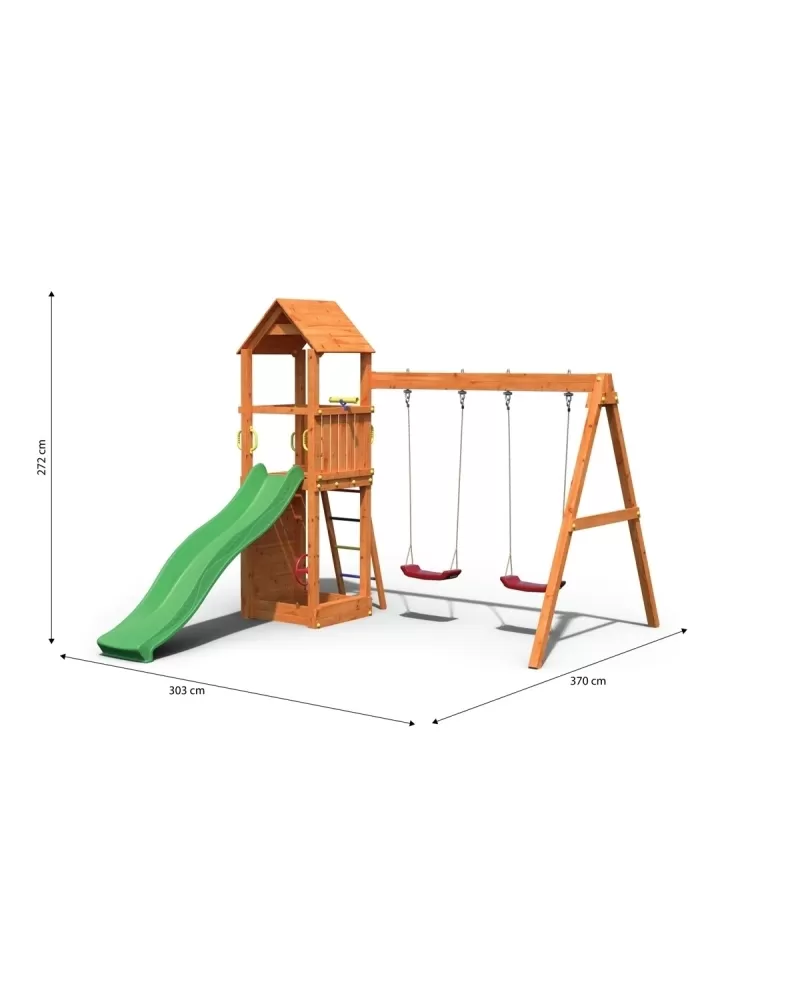 • Proti slunci je bude chránit dřevěná střecha věže. Dětské hřiště MARIMEX PLAY 06 splňuje normy EN 71 Bezpečnosti hraček.