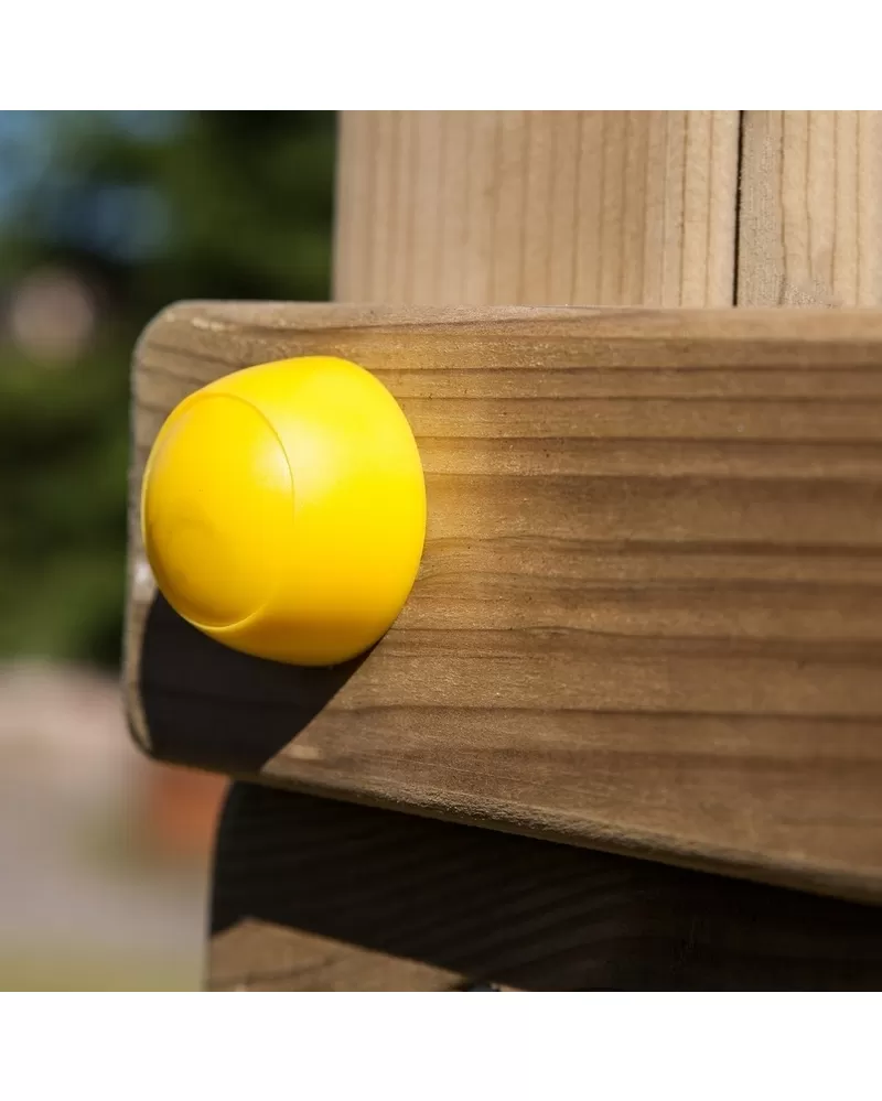 • Použitý dřevěný materiál je opracován tak, aby snižoval riziko zranění dětí, a zároveň je impregnován pro dlouhou životnost a vysokou odolnost celého hřiště.