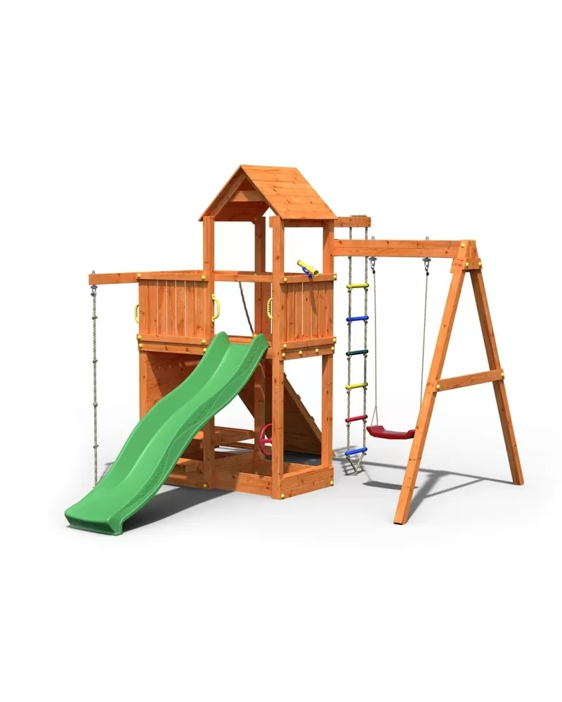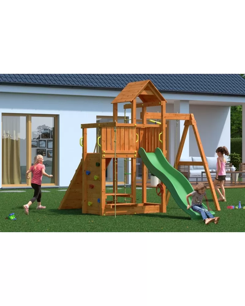 • Použitý borovicový materiál je opracován tak, aby snižoval riziko zranění dětí, a zároveň je impregnován pro dlouhou životnost a vysokou odolnost celého hřiště