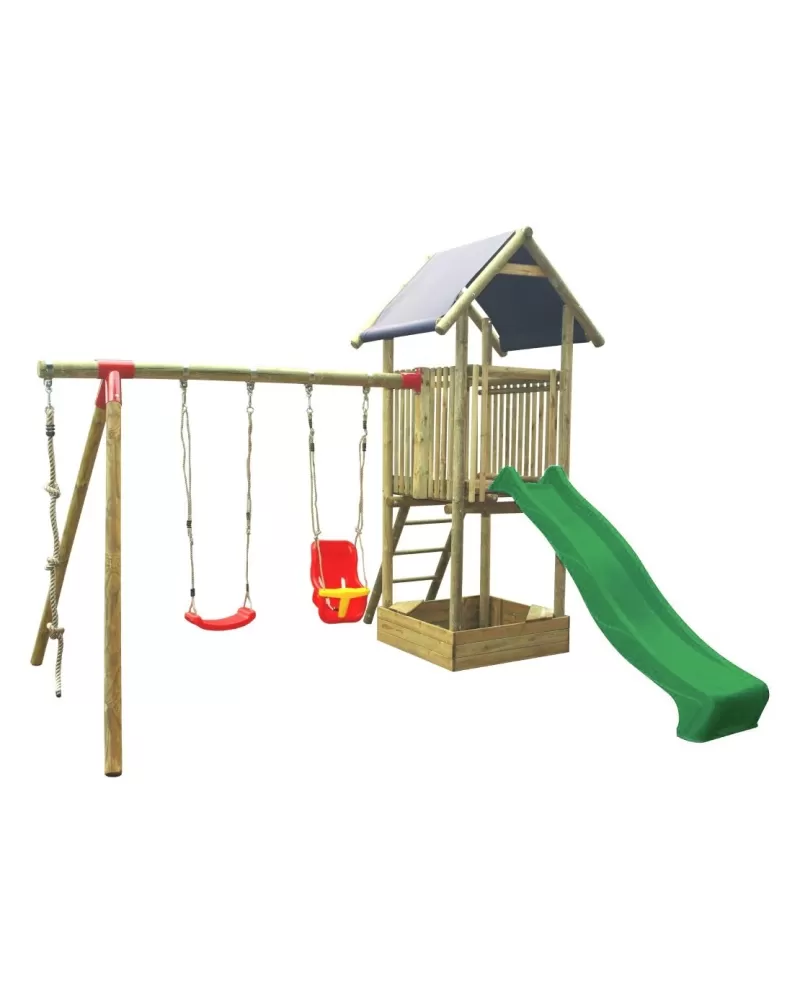• Dětské hřiště MARIMEX PLAY Basic 005 má ve výbavě skluzavku, šplhací lano, houpací sedátko a houpačku i pískoviště se sedátky.