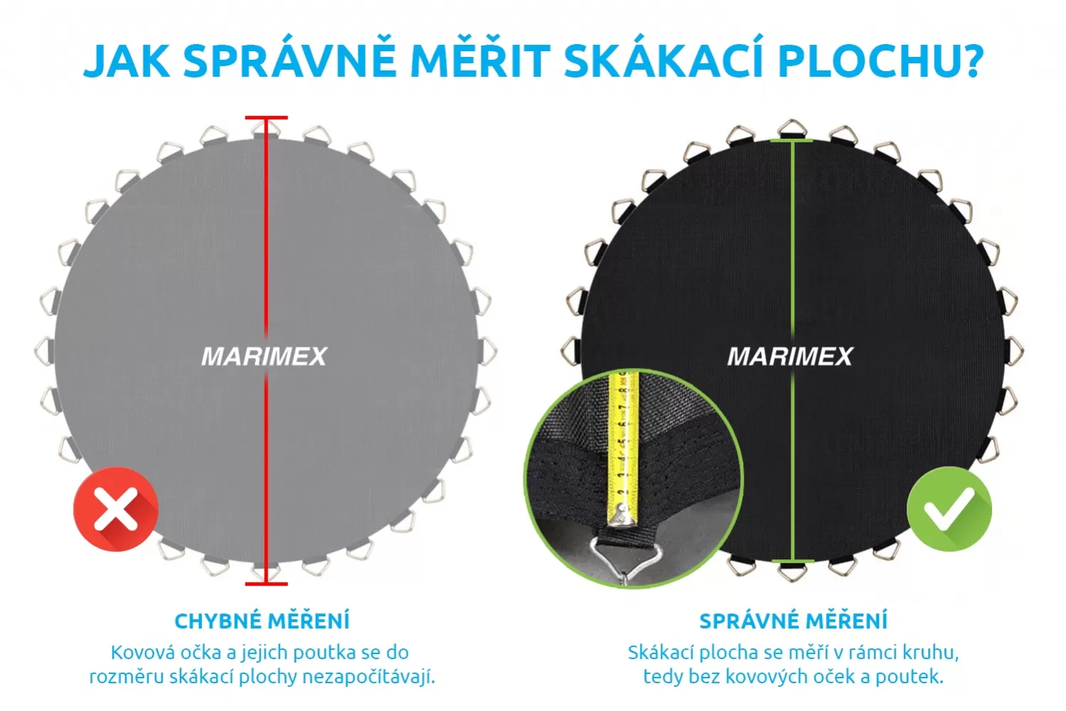 • Průměr skákací plochy: 318 cm (měří se po vlákně tkaniny – od jednoho okraje k druhému přes střed, tolerance rozměru ± 2 cm)