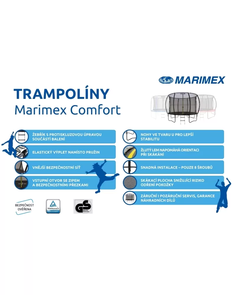 Bezpružinová trampolína Marimex Comfort je výjimečná díky nové technologii upevnění skákací plochy do rámu. Elastický výplet namísto pružin je bezpečnější, zvyšuje flexibilitu odrazové plochy a způsobuje měkčí dopad. Orientaci při skákání napomáhá žlutý lem na odrazové ploše. Bezpečnostní síť na vnější straně trampolíny je pružná a zároveň výborně drží tvar. Instalace kovové konstrukce i sítě je velmi snadná, čítá pouze 16 šroubů.