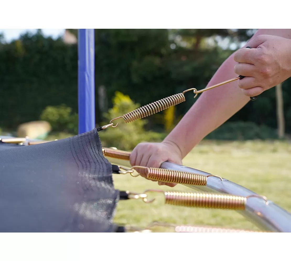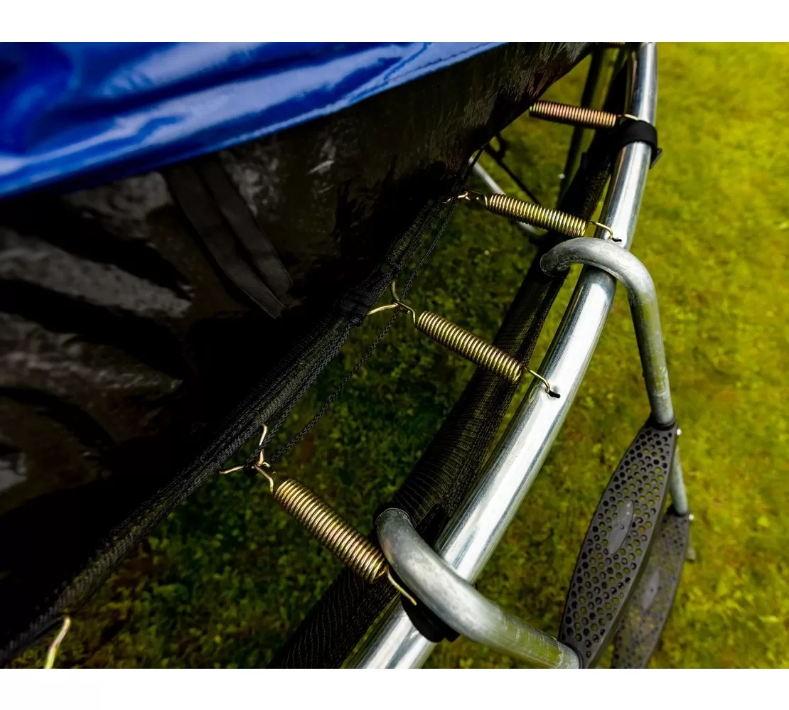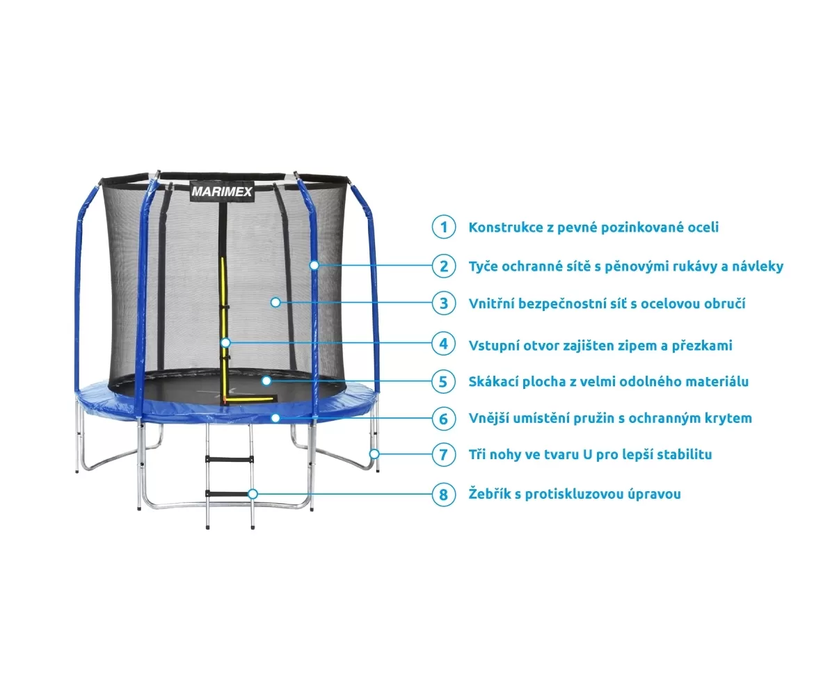 Vnitřní ochrannou síť najdete přímo v balení, nemusíte si ji dokupovat zvlášť. Vnitřní ochranná síť je bezpečnější než vnější síť - brání přístupu skákajícího do části s pružinami. Vstupní prostor je zajištěn třemi přezkami a brání vypadnutí. Tyče jsou obaleny ochranným návlekem z měkčené pěny. Nohy trampolíny jsou samostatné a zvyšují stabilitu celé trampolíny. Spojení tyčí nohou trampolíny a sítě je jištěno speciálními sponami.