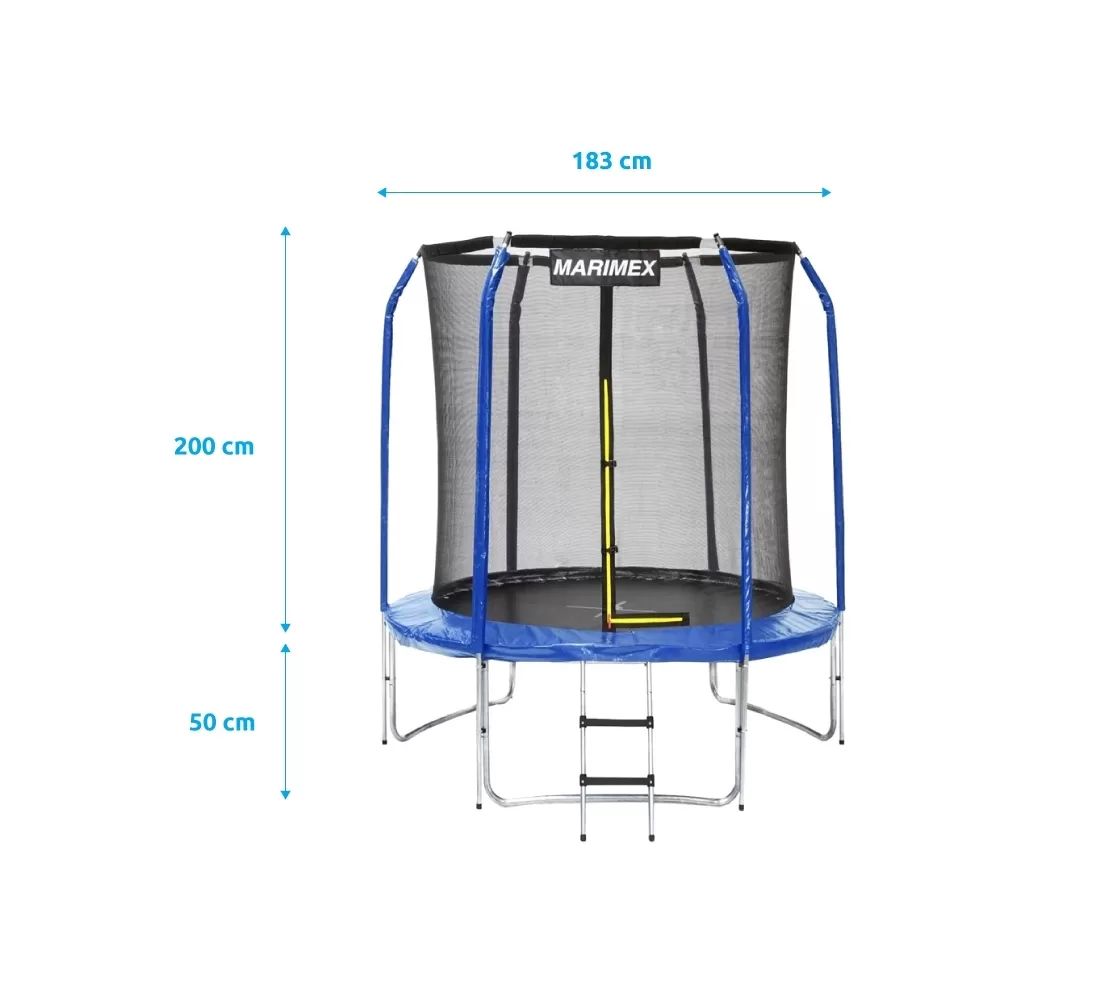 Maximální šířka trampolíny včetně tyčí ochranné sítě: 189 cm