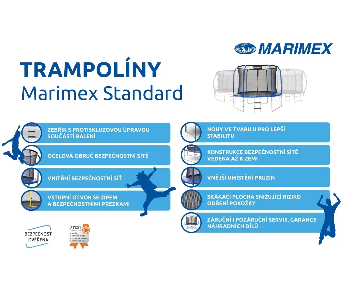 Nejmenší trampolína Marimex z řady standard je skvělým doplňkem každé zahrady. Děti skákání na trampolíně milují a při skákání si snadno zacvičí i dospělí - nosnost je až 50 kg. Dokonalou stabilitu zajišťují tři nohy ve tvaru písmene U.