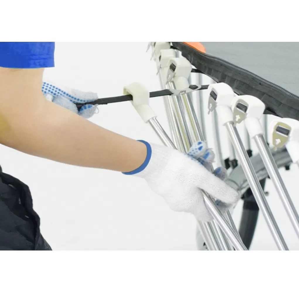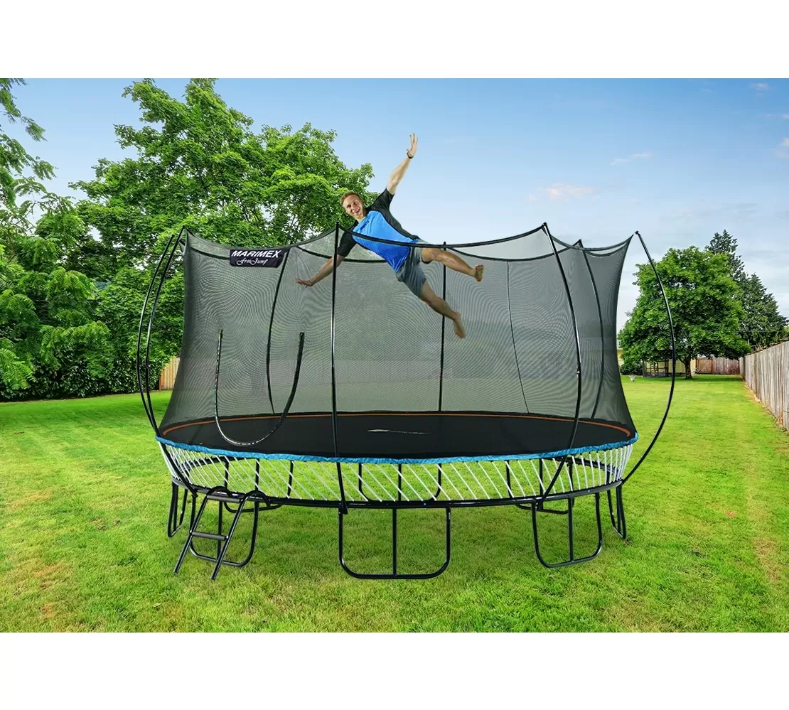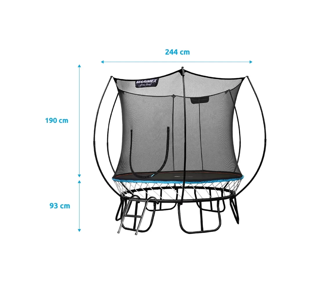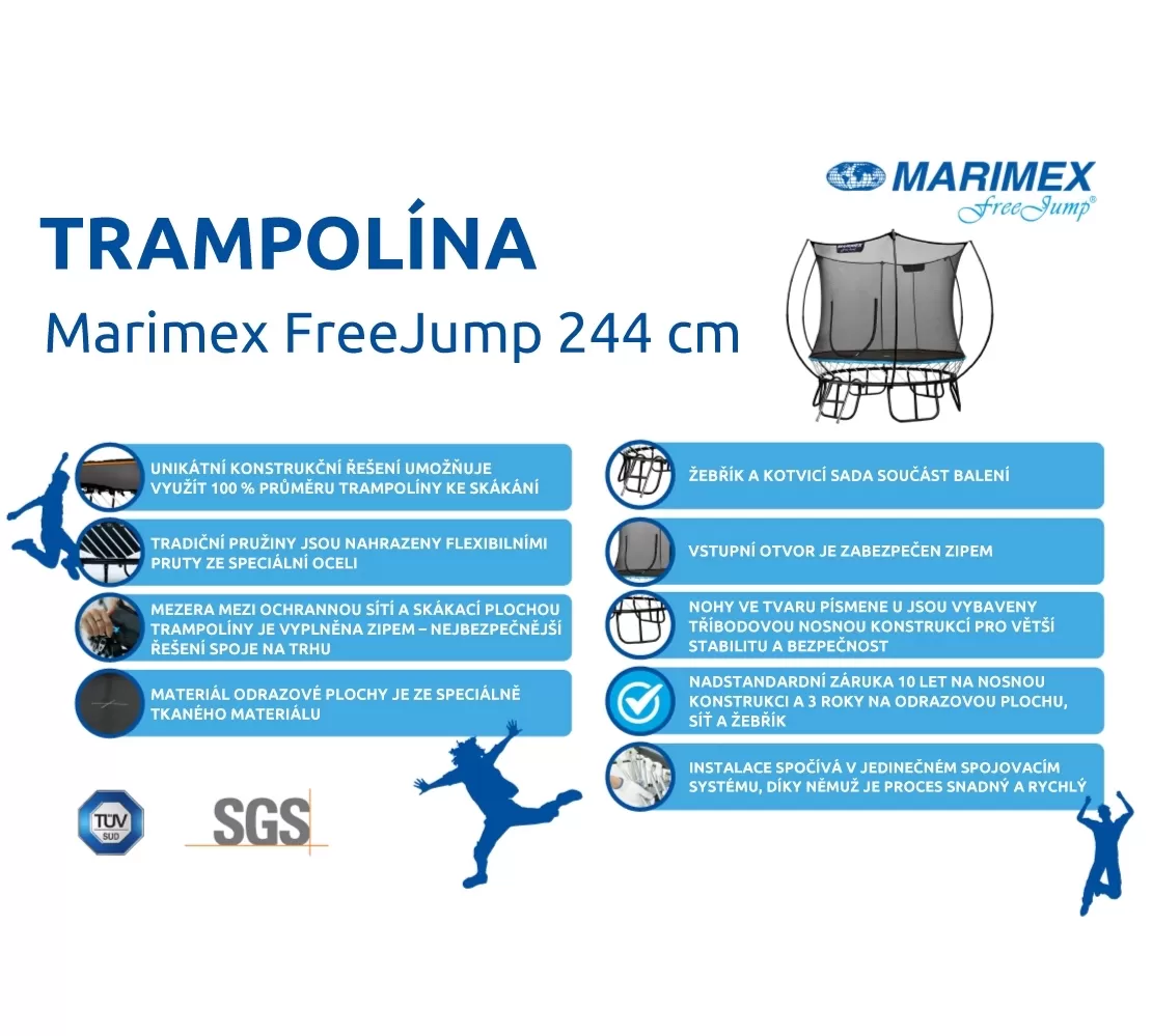 Trampolína Marimex FreeJump nabízí aktuálně nejbezpečnější řešení spoje na trhu, jelikož mezera mezi ochrannou sítí a skákací plochou trampolíny je vyplněna zipem. Tradiční pružiny jsou nahrazeny flexibilními pruty ze speciální oceli, která vyniká vysokou mírou houževnatosti. Výhodou je i nadstandardní záruka 10 let na nosnou konstrukci a 3 roky na odrazovou plochu, síť a žebřík.