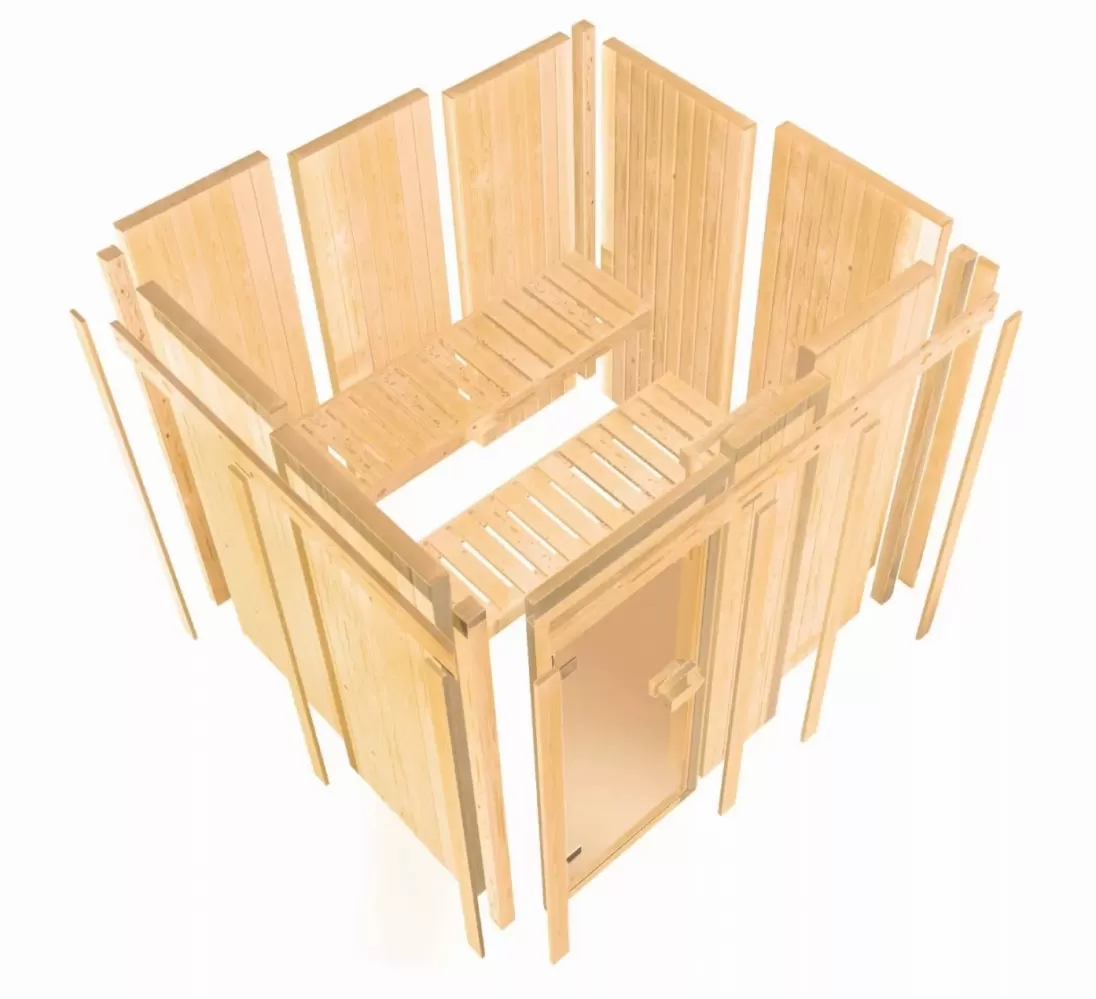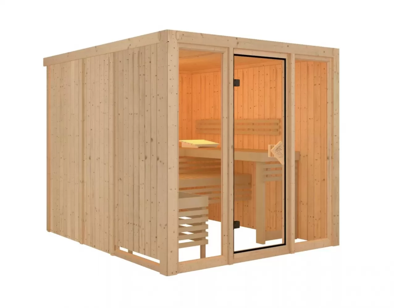 Finská sauna určená až pro tři osoby. Má rozměr š 216 x h 234 x v 198 cm. Tento model finské sauny je určený do temperovaných interiérů domu nebo bytu. Její výrobce, firma KARIBU HOLZTECHNIK z německých Brém, dokázala svými výrobky úspěšně navázat na staletou tradici skandinávského saunování a současně do ní zapracovat dnešní moderní technologie. Sauna je celá vyrobena ze dřeva severského smrku v přírodním provedení. Dřevo pochází ze vzdáleného severu Evropy a je chemicky naprosto neošetřené (není ani namořeno ani nalakováno). V důsledku toho je prosté všech známých problematických látek, které by se v průběhu saunování mohly ze dřeva uvolňovat. Tato interiérová sauna vykazuje mimořádné tepelně-izolační vlastnosti. Stěny sauny jsou složeny z vnitřní a vnější vrstvy speciálně hlazených prken s perem a drážkou, mezi kterými je 42 mm silná tepelná izolace v podobě minerální vlny. Celková síla stěny je tak 68 mm. Zadní nebo boční nepohledové strany orientované ke stěně místnosti mají vnější stranu ze sololitu. Proto jsou při stejné tepelné izolaci o cca 10 mm tenčí než pohledové strany pokryté palubkami.