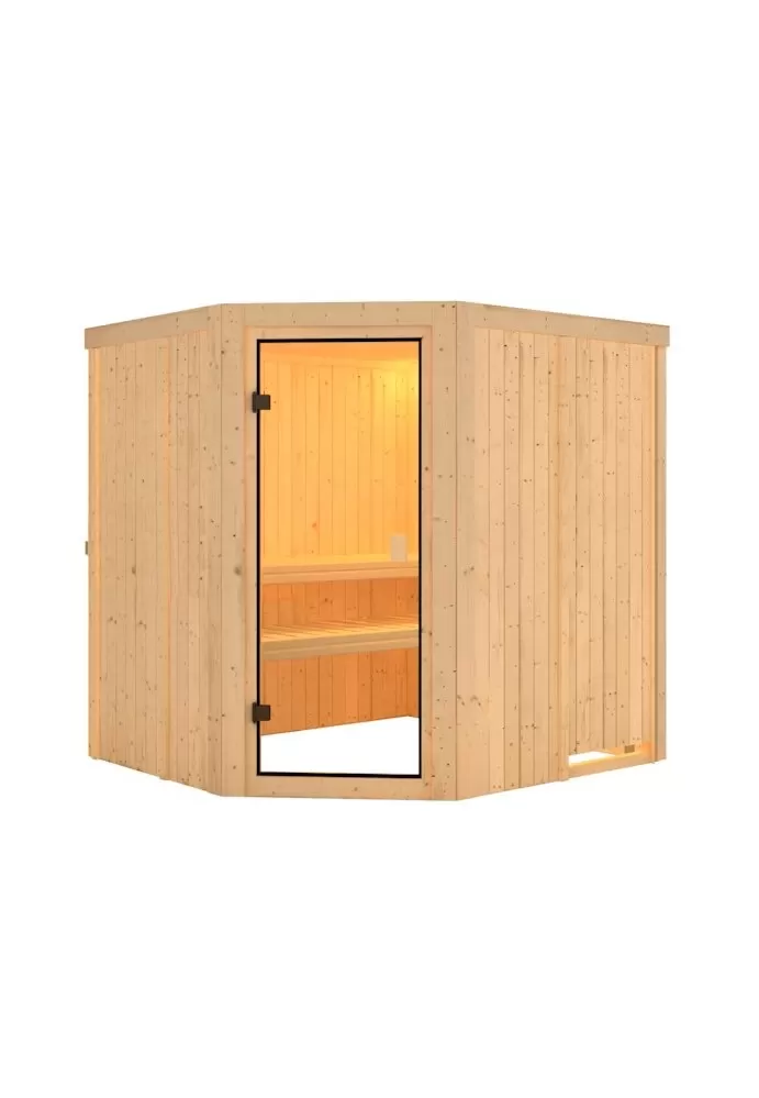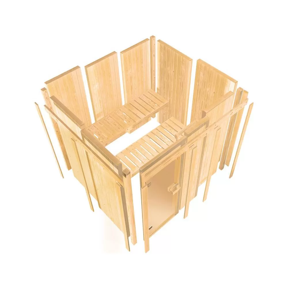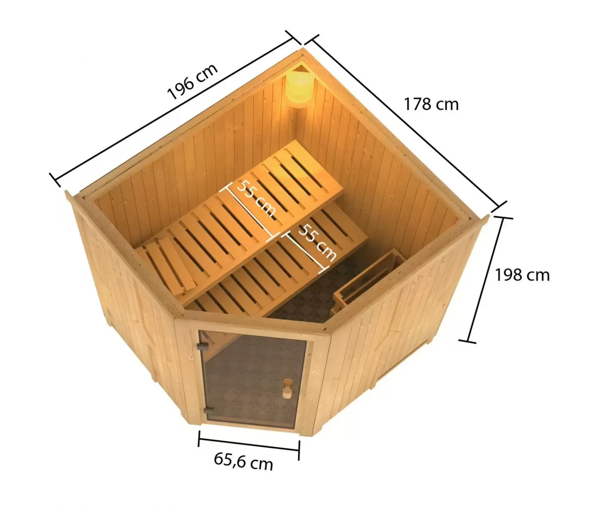 Finská sauna určená pro dvě ležící osoby. Má rozměry š 196 x h 178 x v 198 cm s rohovými dveřmi. Tento model finské sauny je určený do temperovaných interiérů domu nebo bytu. Její výrobce, firma KARIBU HOLZTECHNIK z německých Brém, dokázala svými výrobky úspěšně navázat na staletou tradici skandinávského saunování a současně do ní zapracovat dnešní moderní technologie. Sauna je celá vyrobena ze dřeva severského smrku v přírodním provedení. Dřevo pochází ze vzdáleného severu Evropy a je chemicky naprosto neošetřené (není ani namořeno ani nalakováno). V důsledku toho je prosté všech známých problematických látek, které by se v průběhu saunování mohly ze dřeva uvolňovat. Tato interiérová sauna vykazuje mimořádné tepelně-izolační vlastnosti. Stěny sauny jsou složeny z vnitřní a vnější vrstvy speciálně hlazených prken s perem a drážkou, mezi kterými je 42 mm silná tepelná izolace v podobě minerální vlny. Celková síla stěny je tak 68 mm. Zadní nebo boční nepohledové strany orientované ke stěně místnosti mají vnější stranu ze sololitu. Proto jsou při stejné tepelné izolaci o cca 10 mm tenčí než pohledové strany pokryté palubkami.