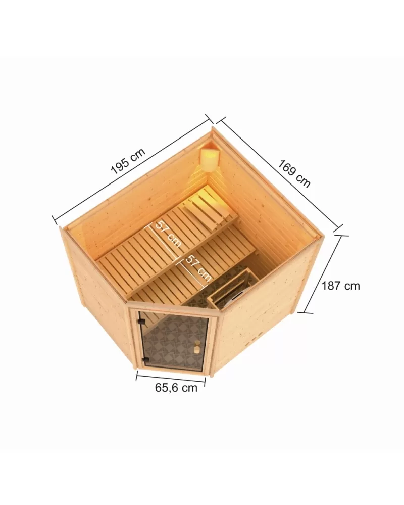 Finská sauna KARIBU ELEA (6170) LG2498 Finská sauna určená až pro dvě osoby. Má rozměr 195 x 169 cm s rohovými dveřmi. Tento model… Celý popis