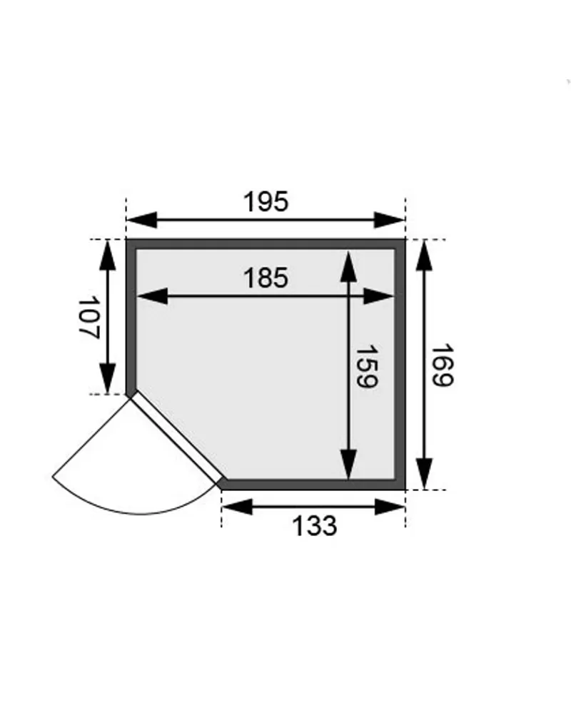 • Má rozměr 195 x 169 cm s rohovými dveřmi.