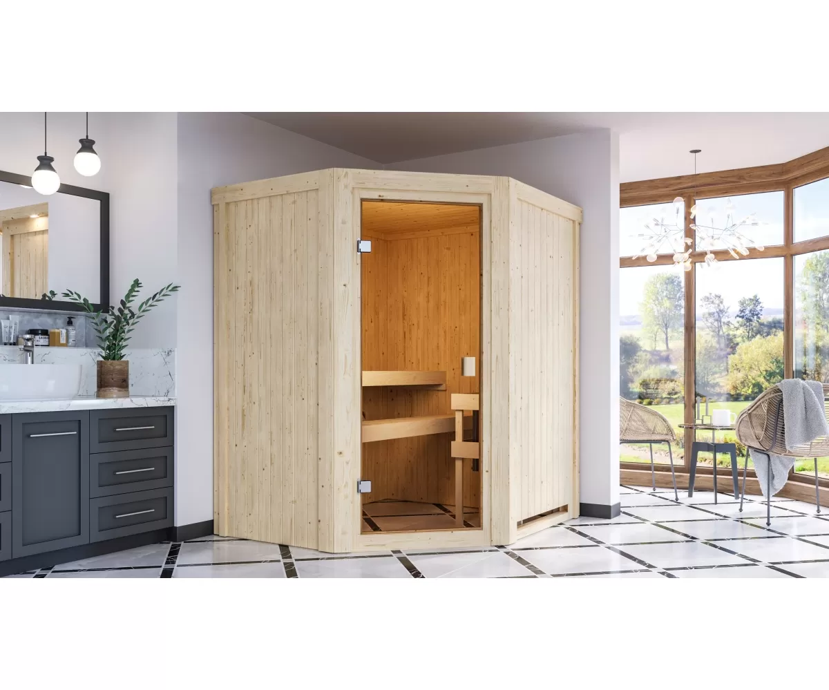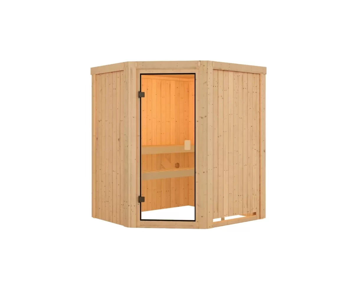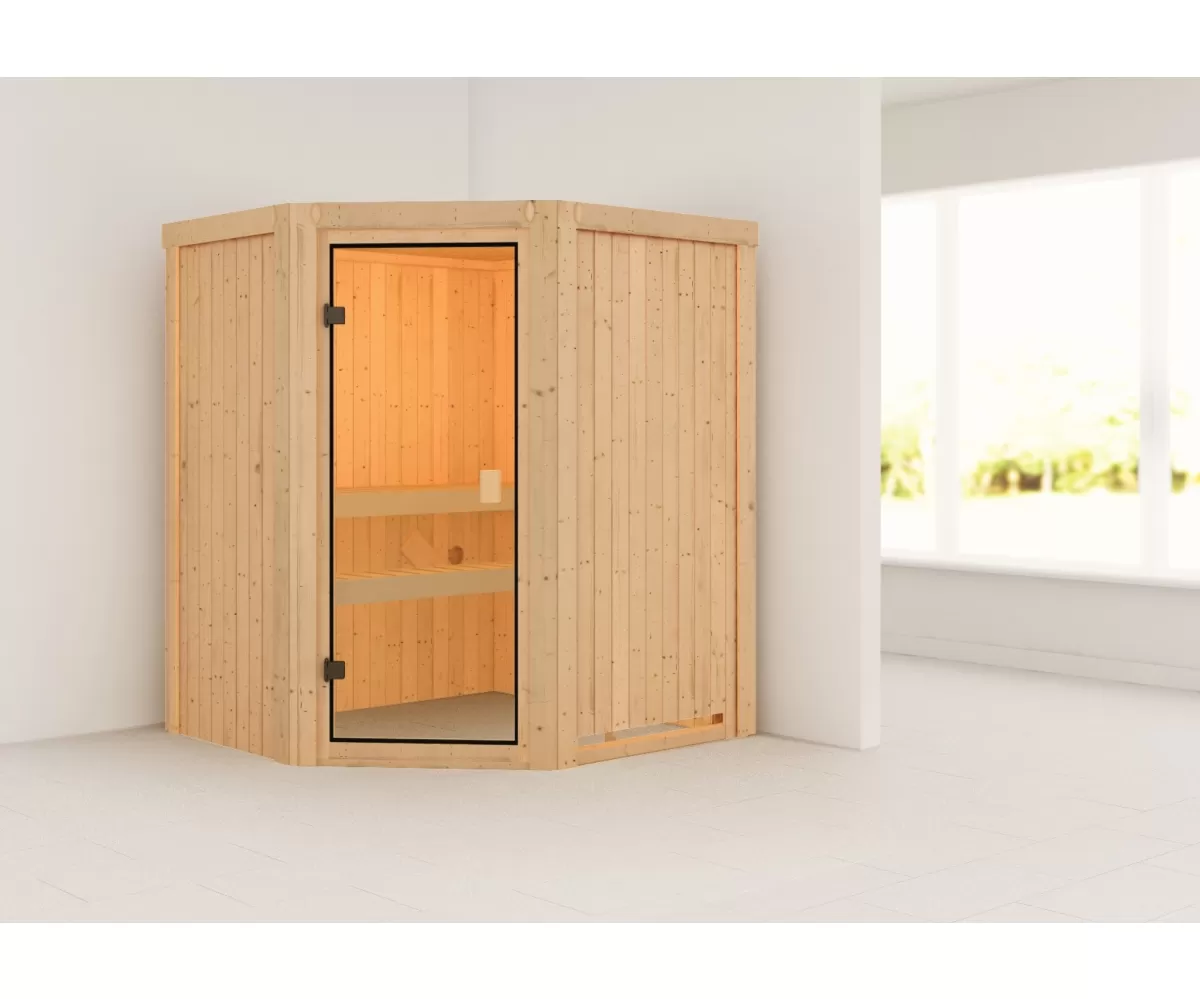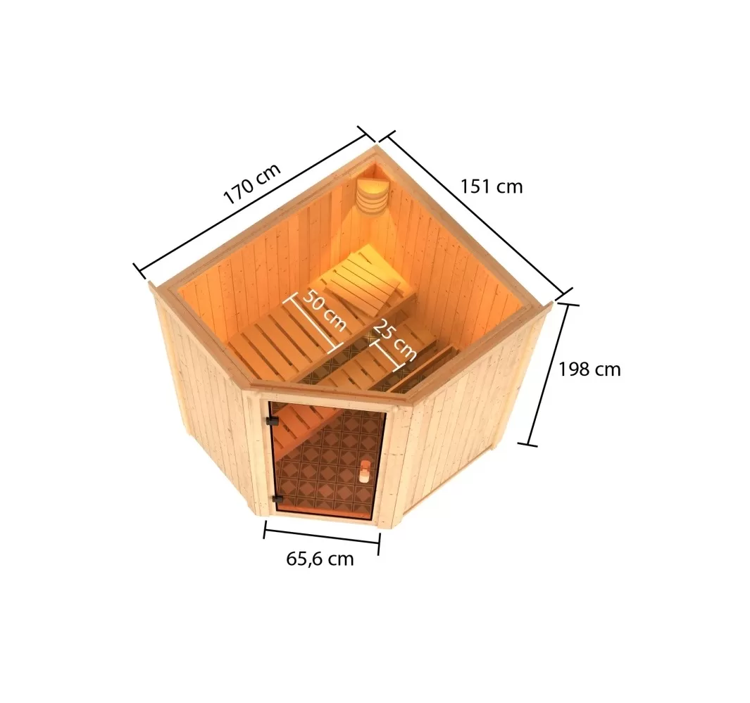 Menší finská sauna určená pro dvě osoby. Má rozměr š 170 x h 151 x v 198 cm s rohovými dveřmi. Tento model finské sauny je určený do temperovaných interiérů domu nebo bytu. Její výrobce, firma KARIBU HOLZTECHNIK z německých Brém, dokázala svými výrobky úspěšně navázat na staletou tradici skandinávského saunování a současně do ní zapracovat dnešní moderní technologie.