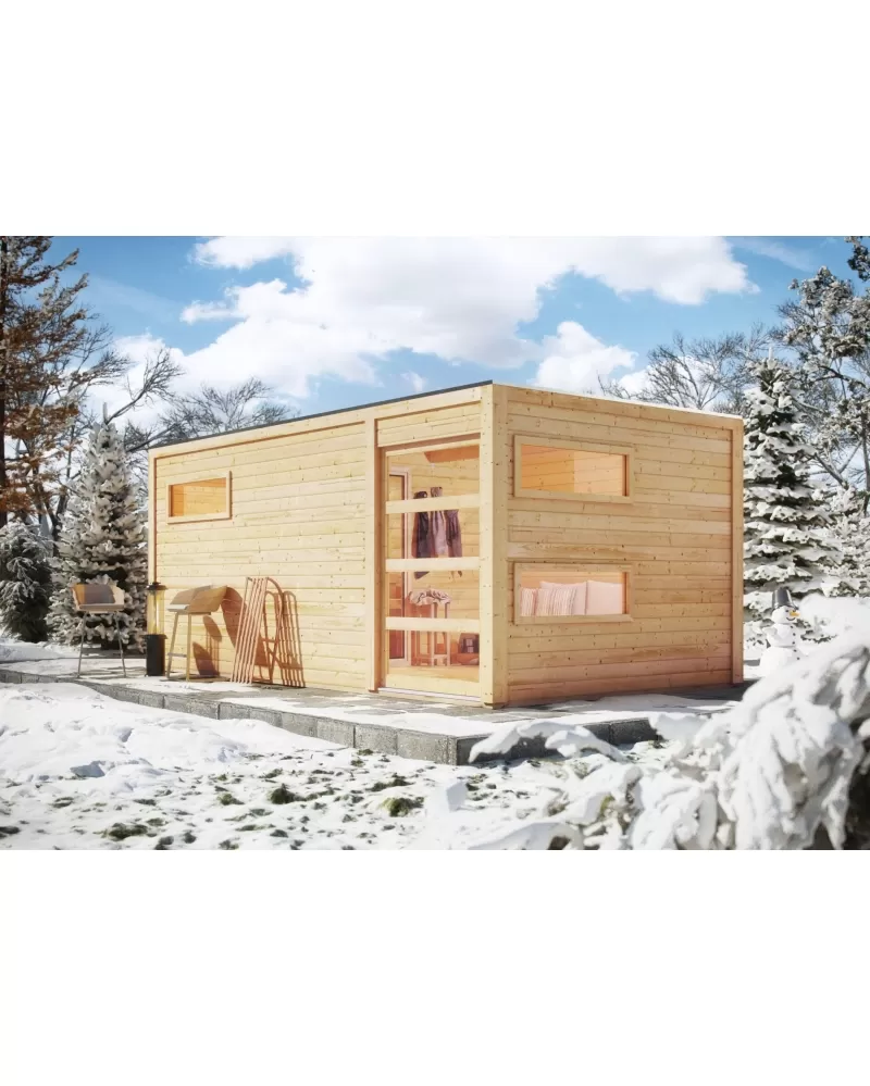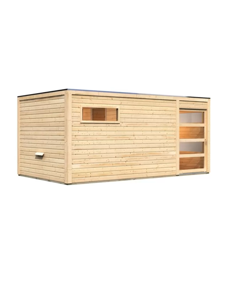 • Venkovní model finské sauny pro vaši zahradu. Moderní design s chromovými rohovými lištami. Její výrobce, firma KARIBU HOLZTECHNIK z německých Brém, dokázala svými výrobky úspěšně navázat na staletou tradici skandinávského saunování a současně do ní zapracovat dnešní moderní technologie. Dodáváme jako stavebnici v rozloženém stavu, kde stěny tvoří jednotlivé dřevěné profily, které pouze sesadíte k sobě a sešroubujete, střechu tvoří celistvá deska. To garantuje jednoduchou montáž, kterou zvládne každý český kutil.