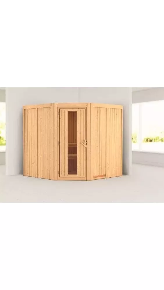 Finská sauna pro dvě osoby. Má čtvercový tvar š 196 x h 196 x v 198cm s rohovým vstupem. Tento model finské sauny je určený do temperovaných interiérů domu nebo bytu. Její výrobce, firma KARIBU HOLZTECHNIK z německých Brém, dokázala svými výrobky úspěšně navázat na staletou tradici skandinávského saunování a současně do ní zapracovat dnešní moderní technologie. Sauna je celá vyrobena ze dřeva severského smrku v přírodním provedení. Dřevo pochází ze vzdáleného severu Evropy a je chemicky naprosto neošetřené (není ani namořeno ani nalakováno). V důsledku toho je prosté všech známých problematických látek, které by se v průběhu saunování mohly ze dřeva uvolňovat. Tato interiérová sauna vykazuje mimořádné tepelně-izolační vlastnosti. Stěny sauny jsou složeny z vnitřní a vnější vrstvy speciálně hlazených prken s perem a drážkou, mezi kterými je 42 mm silná tepelná izolace v podobě minerální vlny. Celková síla stěny je tak 68 mm. Zadní nebo boční nepohledové strany orientované ke stěně místnosti mají vnější stranu ze sololitu. Proto jsou při stejné tepelné izolaci o cca 10 mm tenčí než pohledové strany pokryté palubkami.