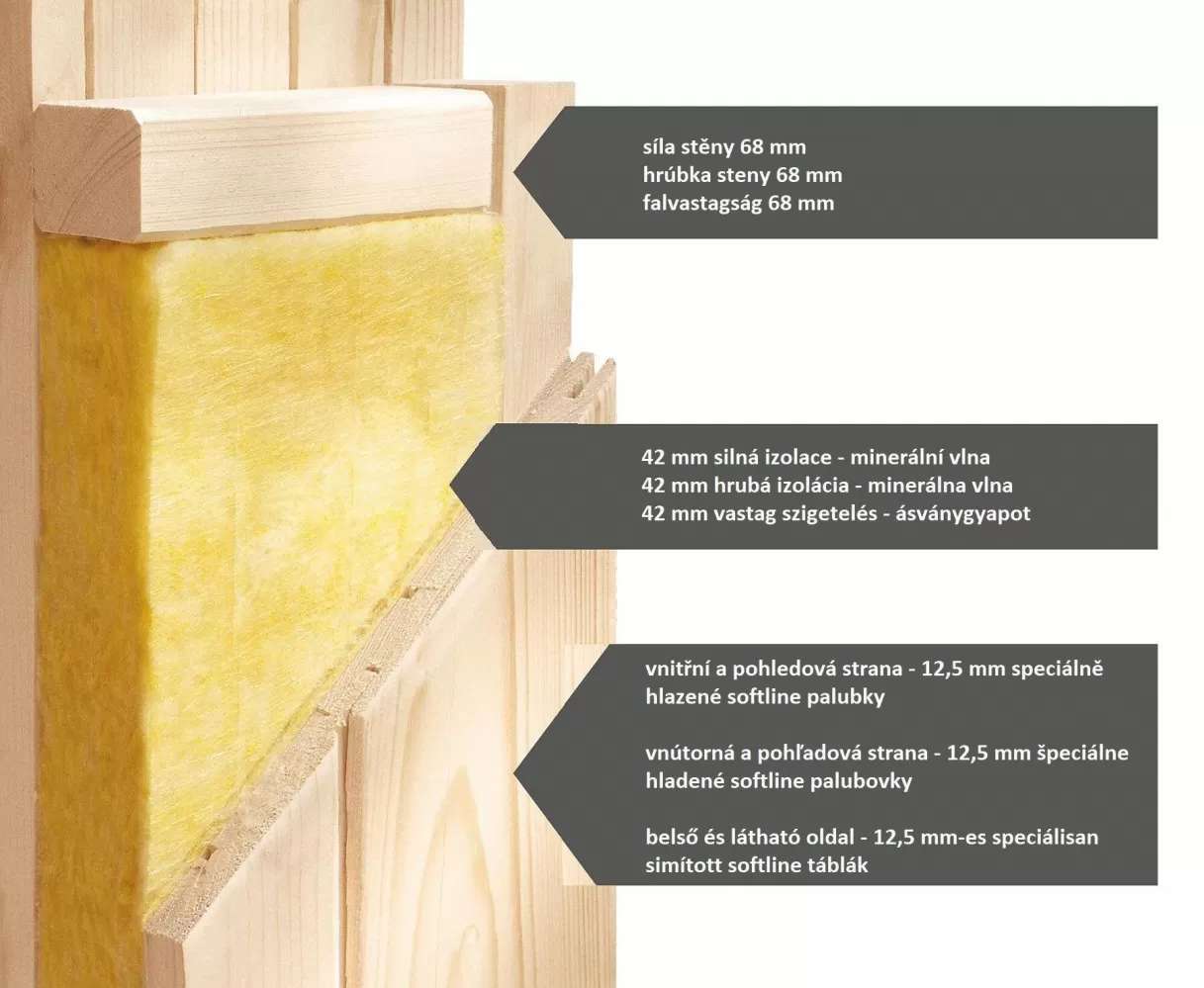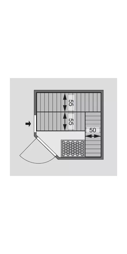Obsahem standardního balení je 3x lavice ze smrkového dřeva (2x šířka 55 cm, 1x šířka 50 cm, max 250 kg), 1x podhlavník a dřevěný ochranný rám na kamna. Doporučujeme další saunové příslušenství z naší nabídky.