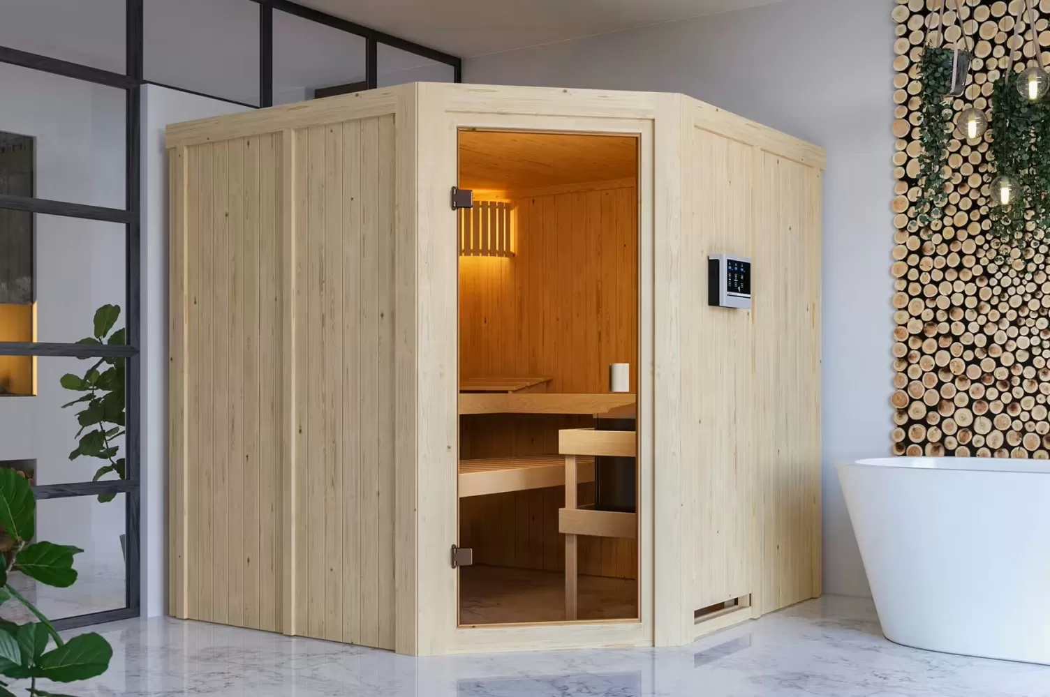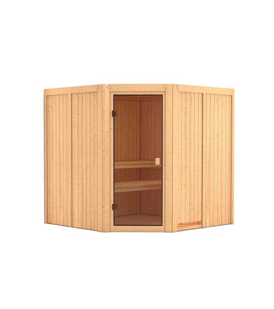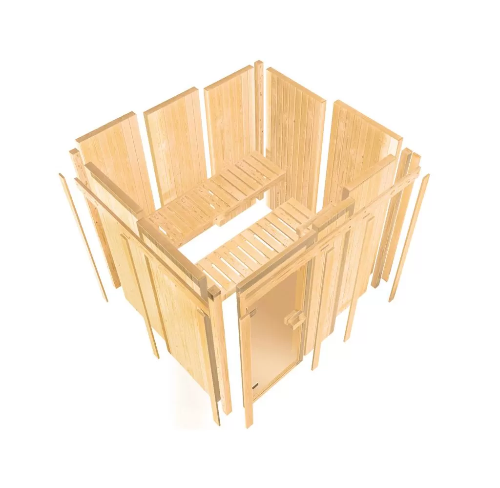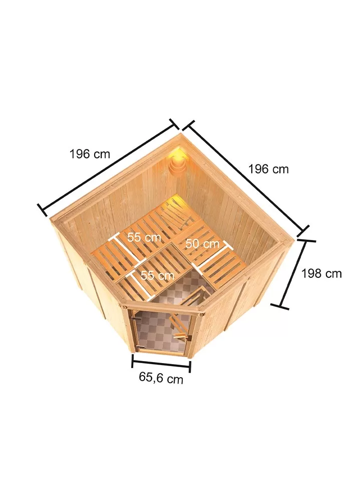 Finská sauna určená pro tři osoby. Má čtvercový tvar š 196 x h 196 x v 198 cm. Tento model finské sauny je určený do temperovaných interiérů domu nebo bytu. Její výrobce, firma KARIBU HOLZTECHNIK z německých Brém, dokázala svými výrobky úspěšně navázat na staletou tradici skandinávského saunování a současně do ní zapracovat dnešní moderní technologie. Sauna je celá vyrobena ze dřeva severského smrku v přírodním provedení. Dřevo pochází ze vzdáleného severu Evropy a je chemicky naprosto neošetřené (není ani namořeno ani nalakováno). V důsledku toho je prosté všech známých problematických látek, které by se v průběhu saunování mohly ze dřeva uvolňovat. Tato interiérová sauna vykazuje mimořádné tepelně-izolační vlastnosti. Stěny sauny jsou složeny z vnitřní a vnější vrstvy speciálně hlazených prken s perem a drážkou, mezi kterými je 42 mm silná tepelná izolace v podobě minerální vlny. Celková síla stěny je tak 68 mm. Zadní nebo boční nepohledové strany orientované ke stěně místnosti mají vnější stranu ze sololitu. Proto jsou při stejné tepelné izolaci o cca 10 mm tenčí než pohledové strany pokryté palubkami.
