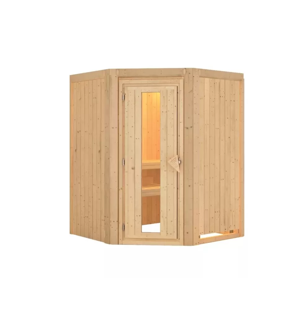 Malá finská sauna určená až pro dvě osoby. Má rozměr š 151 x h 151 x v 198 cm s rohovými dveřmi. Tento model finské sauny je určený do temperovaných interiérů domu nebo bytu. Její výrobce, firma KARIBU HOLZTECHNIK z německých Brém, dokázala svými výrobky úspěšně navázat na staletou tradici skandinávského saunování a současně do ní zapracovat dnešní moderní technologie. Sauna je celá vyrobena ze dřeva severského smrku v přírodním provedení. Dřevo pochází ze vzdáleného severu Evropy a je chemicky naprosto neošetřené (není ani namořeno ani nalakováno). V důsledku toho je prosté všech známých problematických látek, které by se v průběhu saunování mohly ze dřeva uvolňovat. Tato interiérová sauna vykazuje mimořádné tepelně-izolační vlastnosti. Stěny sauny jsou složeny z vnitřní a vnější vrstvy speciálně hlazených prken s perem a drážkou, mezi kterými je 42 mm silná tepelná izolace v podobě minerální vlny. Celková síla stěny je tak 68 mm. Zadní nebo boční nepohledové strany orientované ke stěně místnosti mají vnější stranu ze sololitu. Proto jsou při stejné tepelné izolaci o cca 10 mm tenčí než pohledové strany pokryté palubkami.