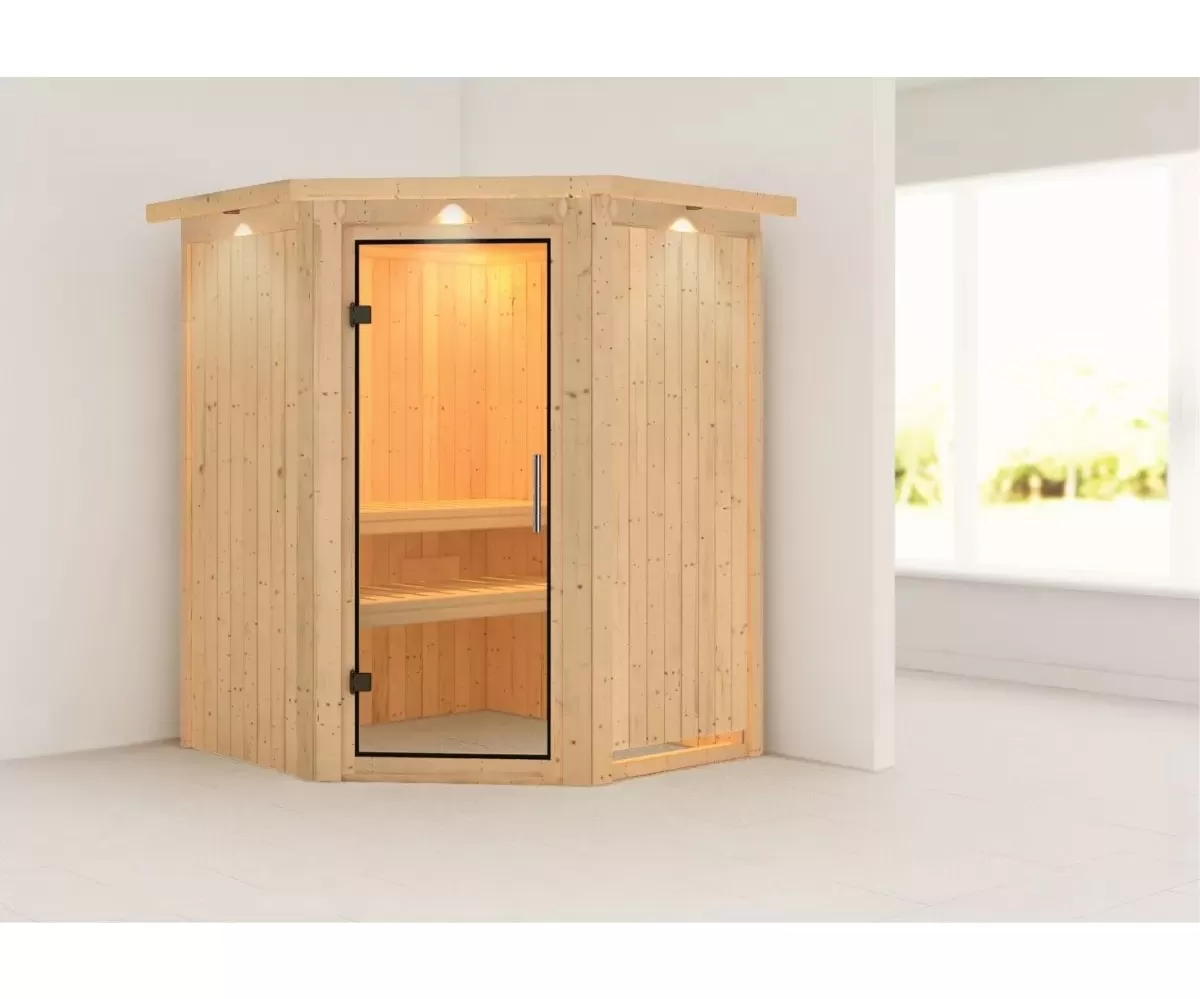 Malá finská sauna určená až pro dvě osoby. Má rozměr š 151 x h 151 x v 198 cm s rohovými dveřmi. Tento model finské sauny je určený do temperovaných interiérů domu nebo bytu. Její výrobce, firma KARIBU HOLZTECHNIK z německých Brém, dokázala svými výrobky úspěšně navázat na staletou tradici skandinávského saunování a současně do ní zapracovat dnešní moderní technologie. Sauna je celá vyrobena ze dřeva severského smrku v přírodním provedení. Dřevo pochází ze vzdáleného severu Evropy a je chemicky naprosto neošetřené (není ani namořeno ani nalakováno). V důsledku toho je prosté všech známých problematických látek, které by se v průběhu saunování mohly ze dřeva uvolňovat. Tato interiérová sauna vykazuje mimořádné tepelně-izolační vlastnosti. Stěny sauny jsou složeny z vnitřní a vnější vrstvy speciálně hlazených prken s perem a drážkou, mezi kterými je 42 mm silná tepelná izolace v podobě minerální vlny. Celková síla stěny je tak 68 mm. Zadní nebo boční nepohledové strany orientované ke stěně místnosti mají vnější stranu ze sololitu. Proto jsou při stejné tepelné izolaci o cca 10 mm tenčí než pohledové strany pokryté palubkami.