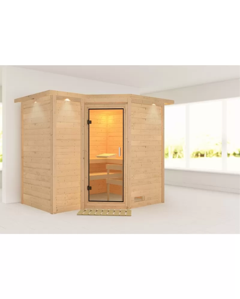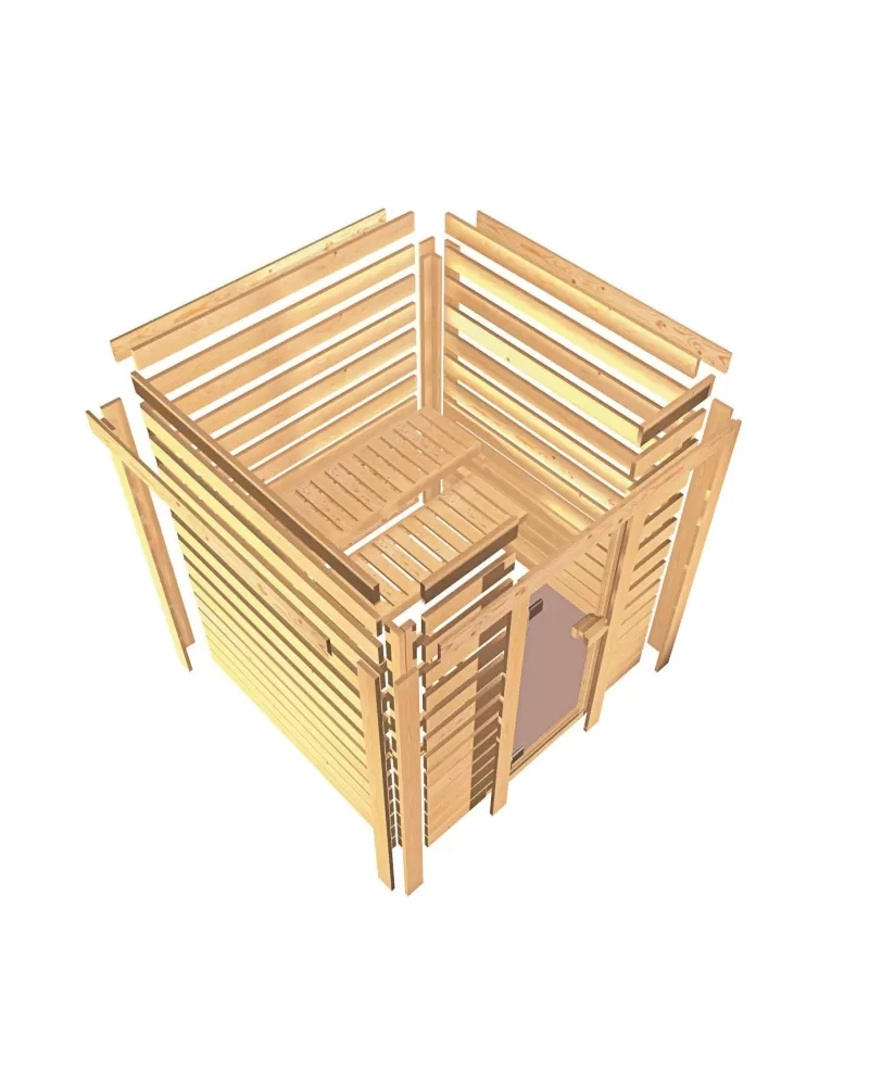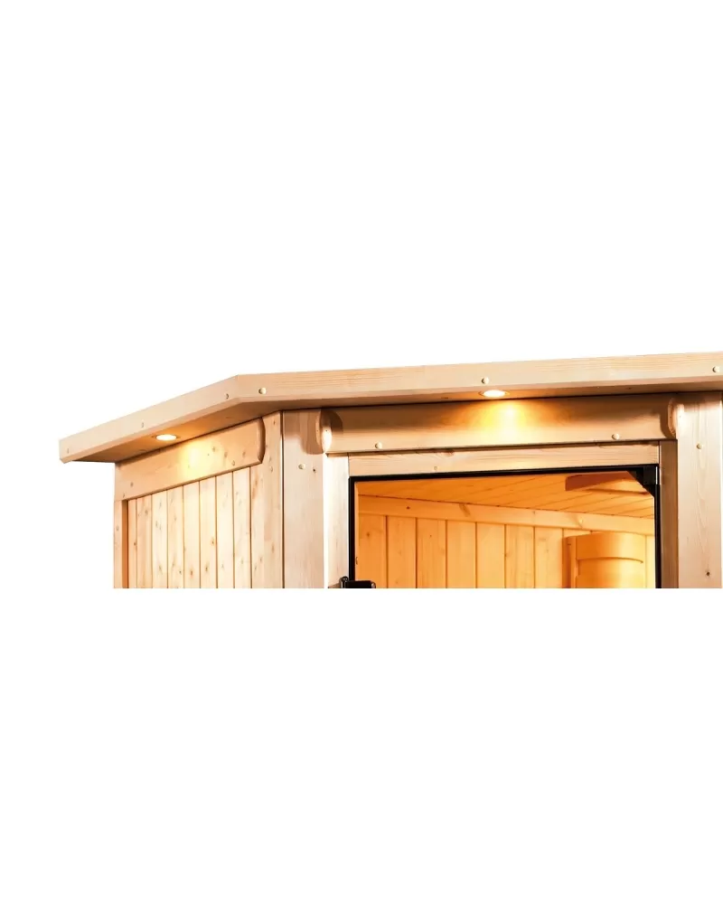 • Finská sauna určená pro tři ležící osoby. Má rozměr 264 x 198 cm. Tento model finské sauny je určený do temperovaných interiérů domu nebo bytu. Střešní římsa včetně 3 LED světel šikovně dotváří atmosféru sauny. Její výrobce, firma KARIBU HOLZTECHNIK z německých Brém, dokázala svými výrobky úspěšně navázat na staletou tradici skandinávského saunování a současně do ní zapracovat dnešní moderní technologie. Sauna je celá vyrobena ze dřeva severského smrku v přírodním provedení. Dřevo pochází ze vzdáleného severu Evropy a je chemicky naprosto neošetřené (není ani namořeno ani nalakováno). V důsledku toho je prosté všech známých problematických látek, které by se v průběhu saunování mohly ze dřeva uvolňovat. Tato interiérová sauna je vyrobena z masivního dřeva síly 40 mm. Stěny sauny jsou složeny ze speciálně hlazených prken s dvojitým perem a drážkou, což garantuje neobyčejnou pevnost spoje.