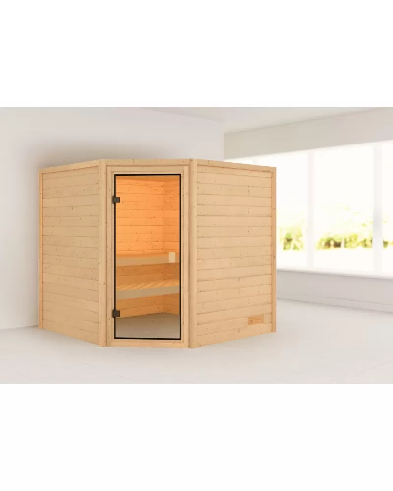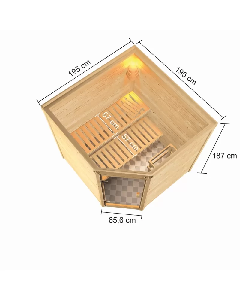 Finská sauna KARIBU TILDA (6174) LG2496 Finská sauna určená až pro dvě osoby. Má rozměr 195 x 195 cm s rohovými dveřmi. Tento model… Celý popis