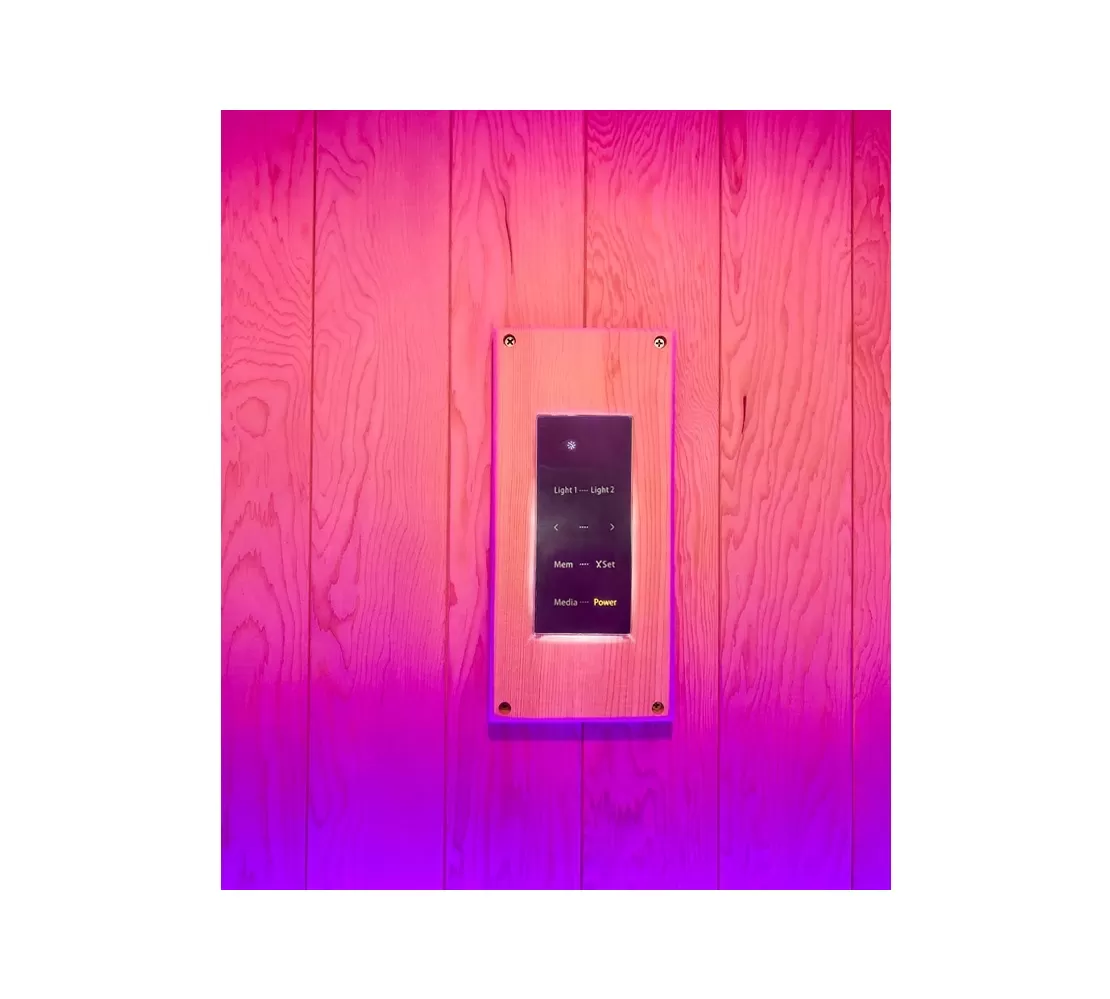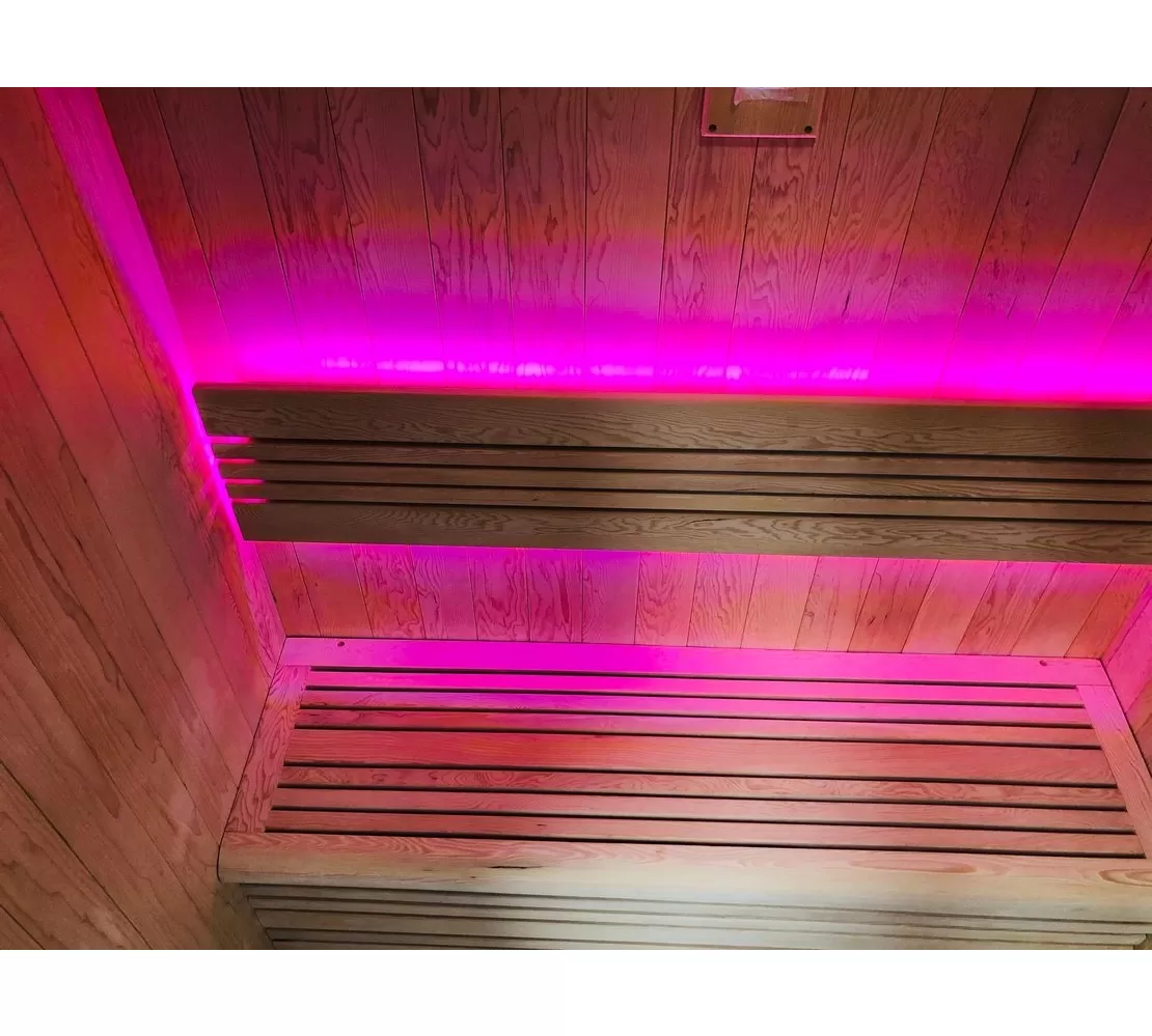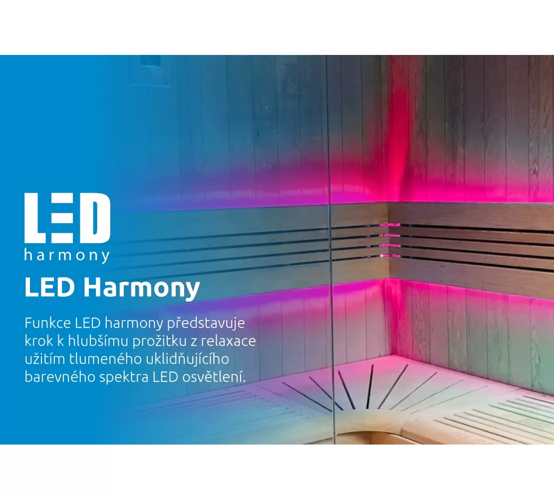 • Sauna disponuje stropním osvětlením a barevnou LED terapií - hvězdné nebe + podsvícení opěrky zad.