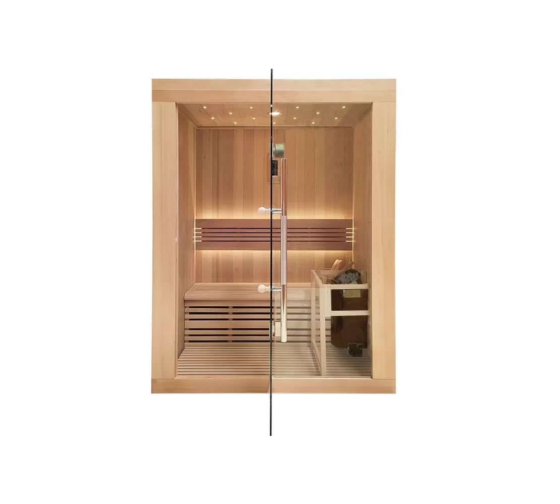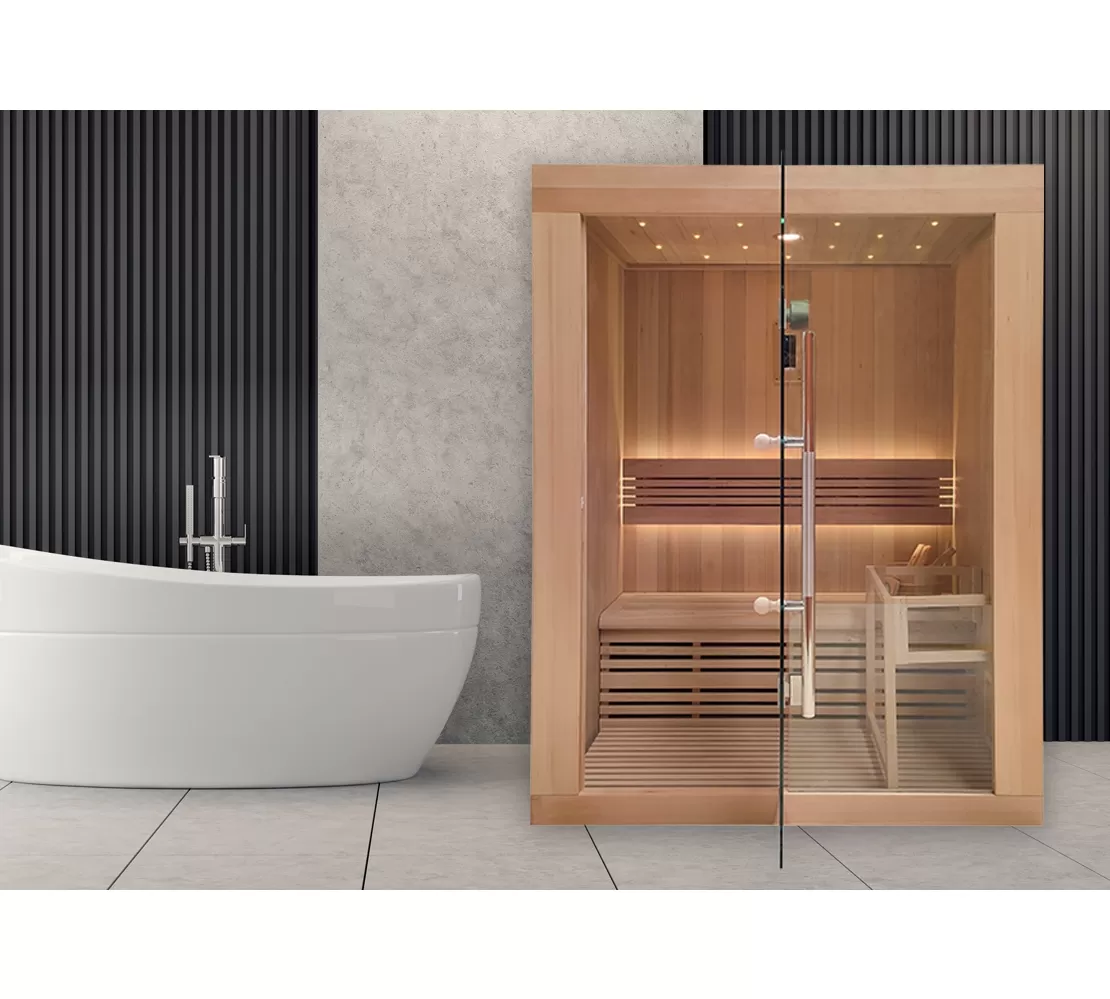 • Sauna je vyrobena z dřeva kanadského jedlovce – hemlocku. Mezi jeho hlavní přednosti patří odolnost, bezsukovost a vynikající tepelněizolační vlastnosti