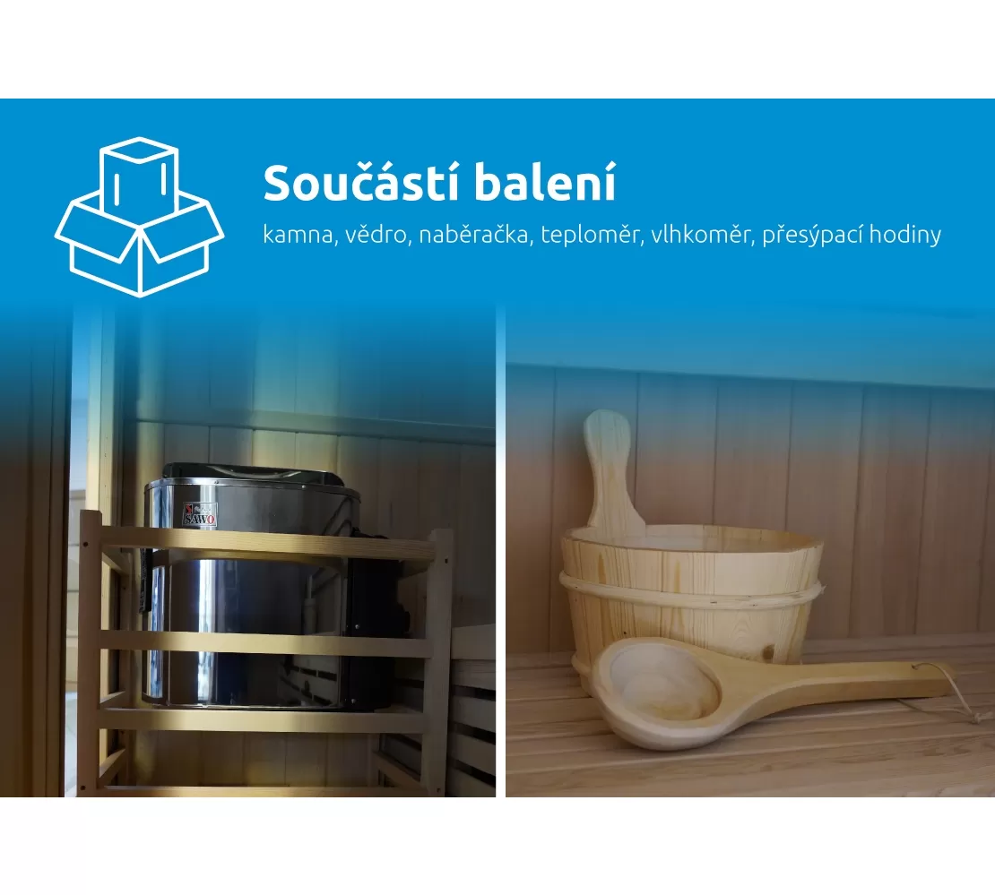 • Saunové příslušenství - vědro, naběračka, teploměr, vlhkoměr, přesýpací hodiny