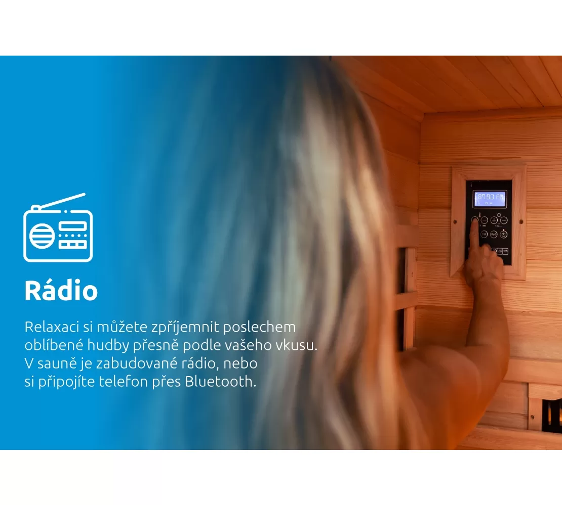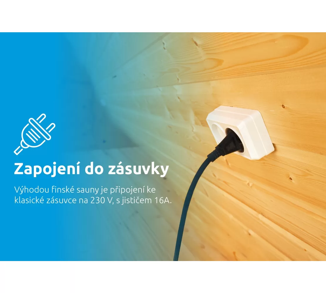 • Výhodou finské sauny je připojení ke klasické zásuvce na 230 V, s jističem 16A.