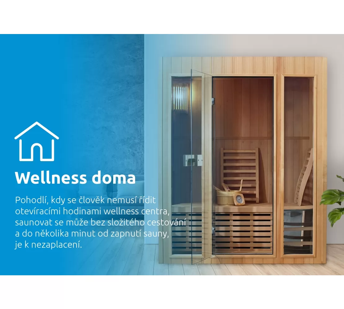 • Pohodlí, kdy se člověk nemusí řídit otevíracími hodinami wellness centra, saunovat se může bez složitého cestování a do několika minut od zapnutí sauny, je k nezaplacení.