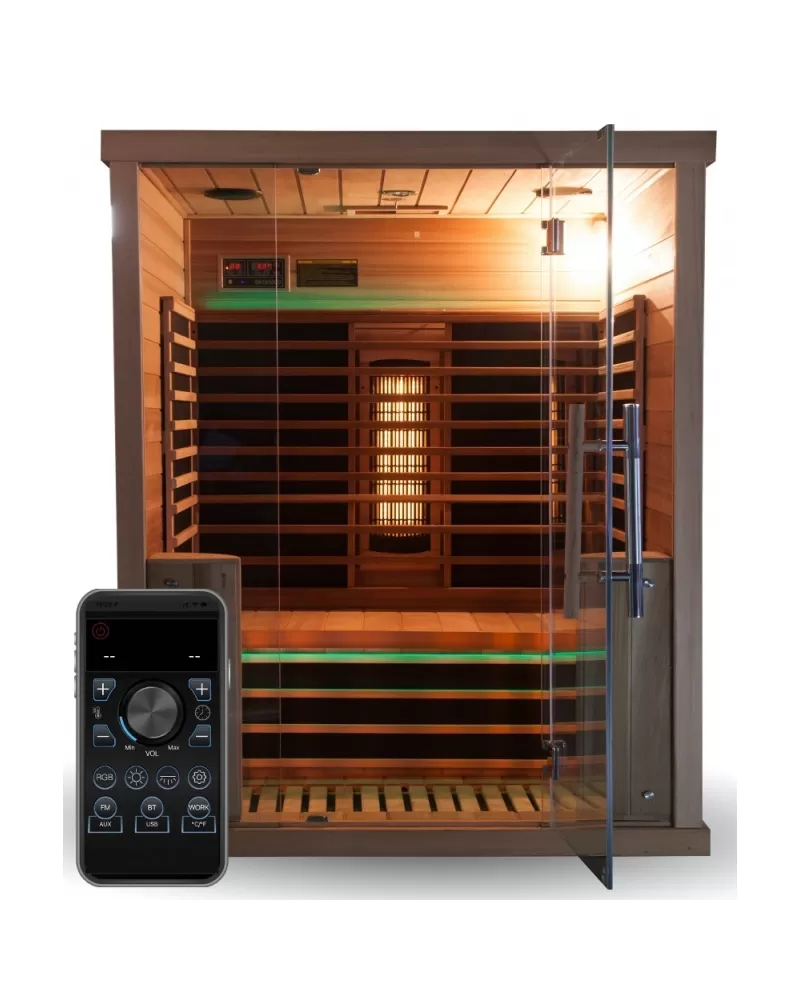 Tato sada Vám umožní ovládat Vaší infrasaunu nejen prostřednictvím ovládacího panelu umístěného v infrasauně, ale také prostřednictvím nainstalované aplikace na Vašem chytrém zařízení s operačním systémem Android a iOS. Prostřednictvím nainstalované aplikace můžete infrasaunu plnohodnotně ovládat. Jsou zde obsaženy všechny ovládací prvky Sauna a Entertainment Modu. Maximální nastavitelná teplota je 65°C.