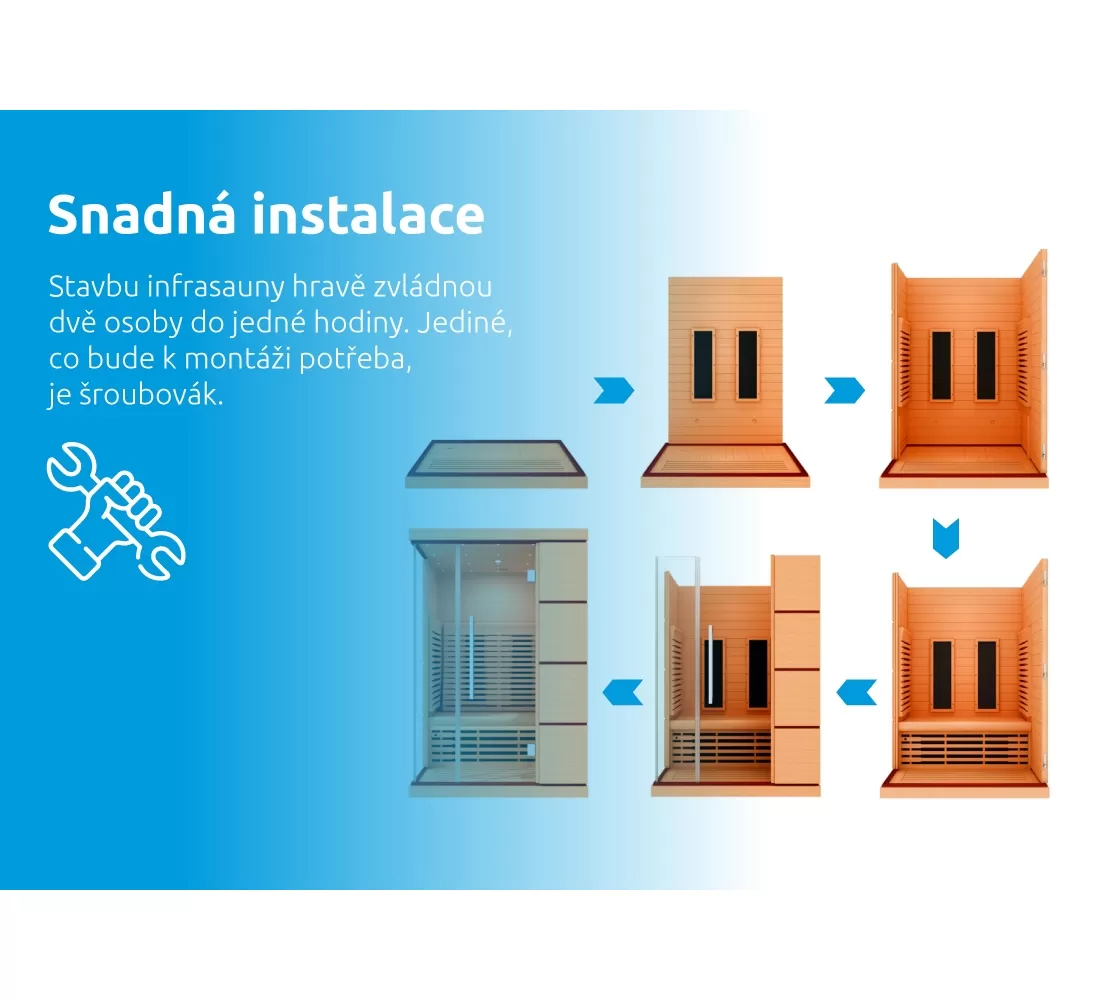 • Stavbu infrasauny hravě zvládnou dvě osoby do jedné hodiny. Jediné, co bude k montáži potřeba, je šroubovák.