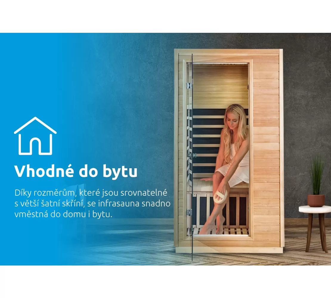 • Malé rozměry dovolují infrasaunu umístit v rodinném domě i prostornějším bytě.