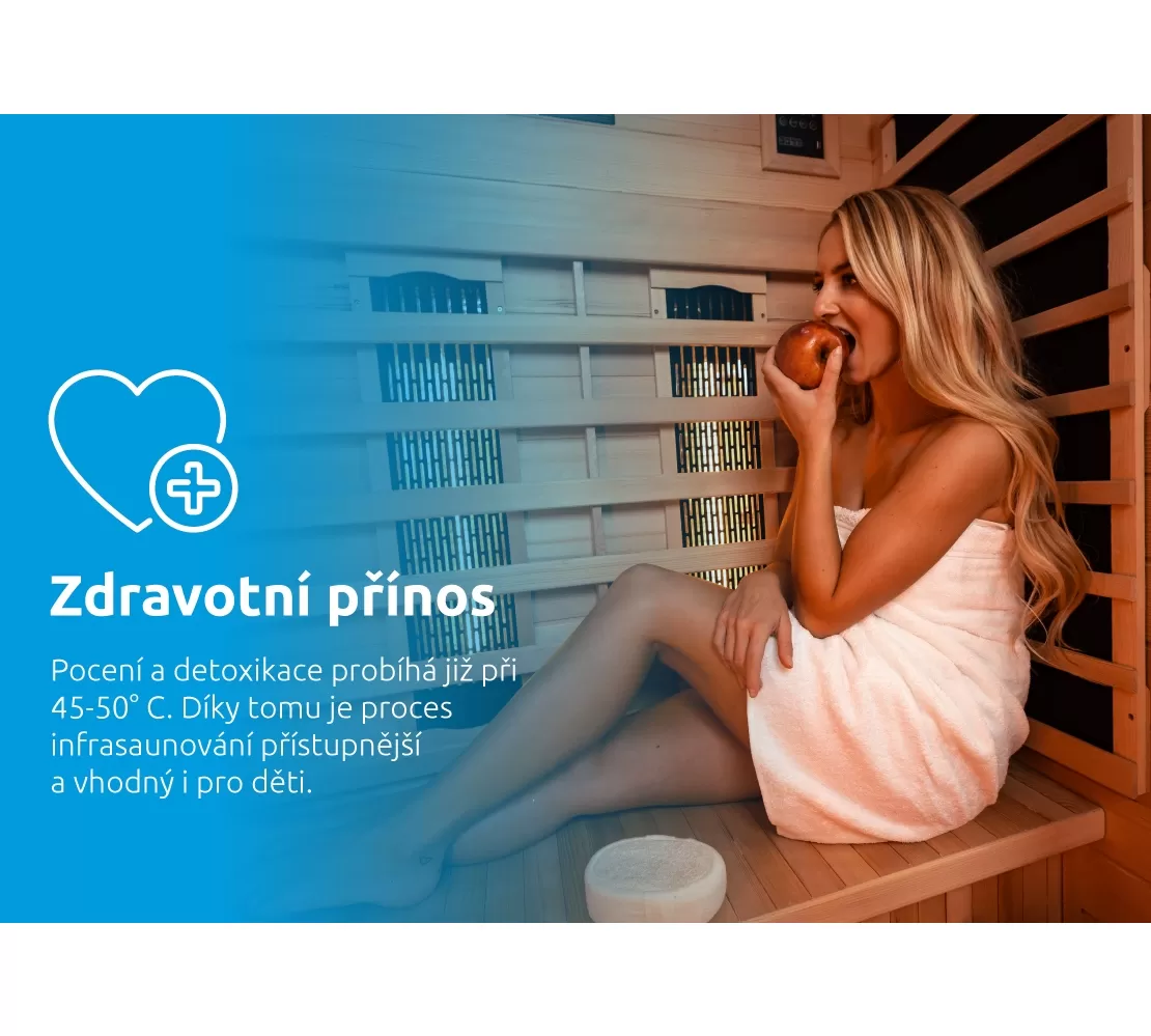 • Pocení a detoxikace probíhá již při 45-50° C. Díky tomu je proces infrasaunování přístupnější a vhodný i pro děti.