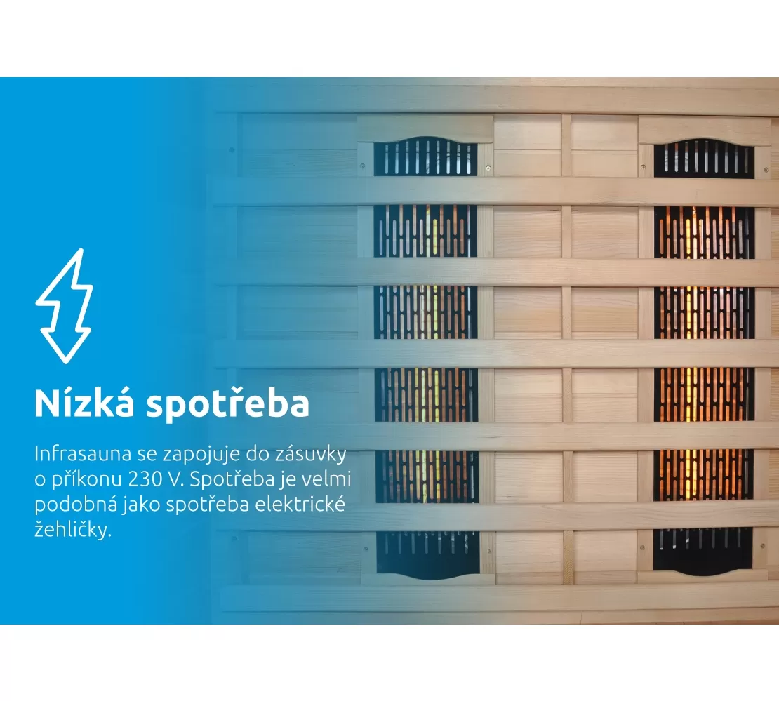 • Infrasauna se zapojuje do zásuvky o příkonu 230 V. Spotřeba je velmi podobná jako spotřeba elektrické žehličky.
