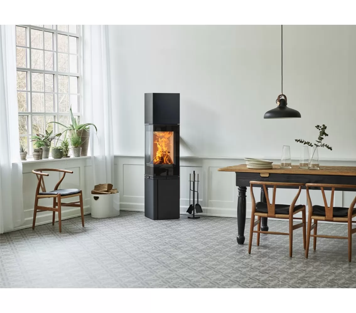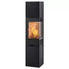 Dvouplášťová konvekční ocelová kamna v elegantním hranatém provedení s rohovým prosklením dvířek a vysokou nástavbou. Podstavec je otvírací a prostor je vhodný k uložení dřeva.